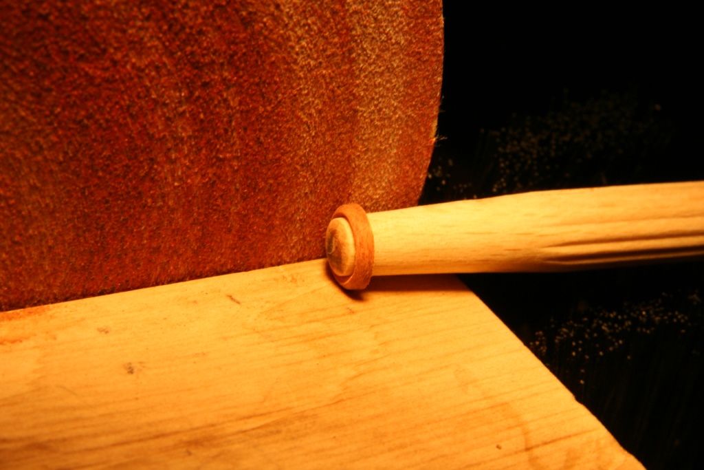 Powoli zaczną się prace na pokładzie więc myślę, że dobry moment na wykonanie podstawki. Drewno bukowe, po odrysowaniu kształtu większość wyszlifowana na szlifierce tarczowej natomiast wewnętrzny mały łuk za pomocą wiertarki z "patykiem szlifierskim" wykonanym z kołka bukowego 8mm oklejonego paskiem papieru gr120 (pokazany na zdj.). Wycinanie piłką włosową trwałoby kilka razy dłużej.
