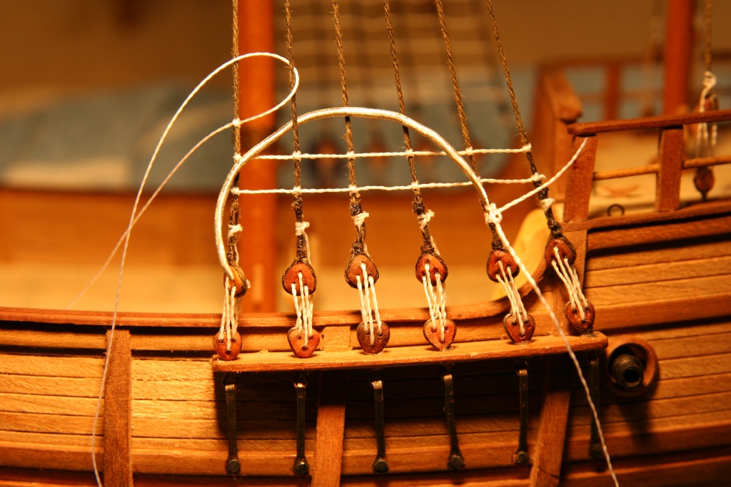 Relingi na pokładzie rufowym zamontowane. Patyczek średnica 1mm wyszlifowany wcześniej pokazanym sposobem na szliwowanie masztów. Słupki wycięte dłuższe i po sklejeniu z patyczkiem-poprzeczką doszlifowana całość na wymaganą długość.