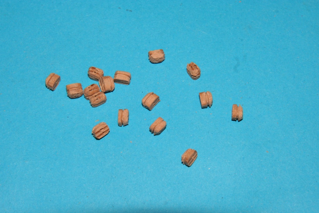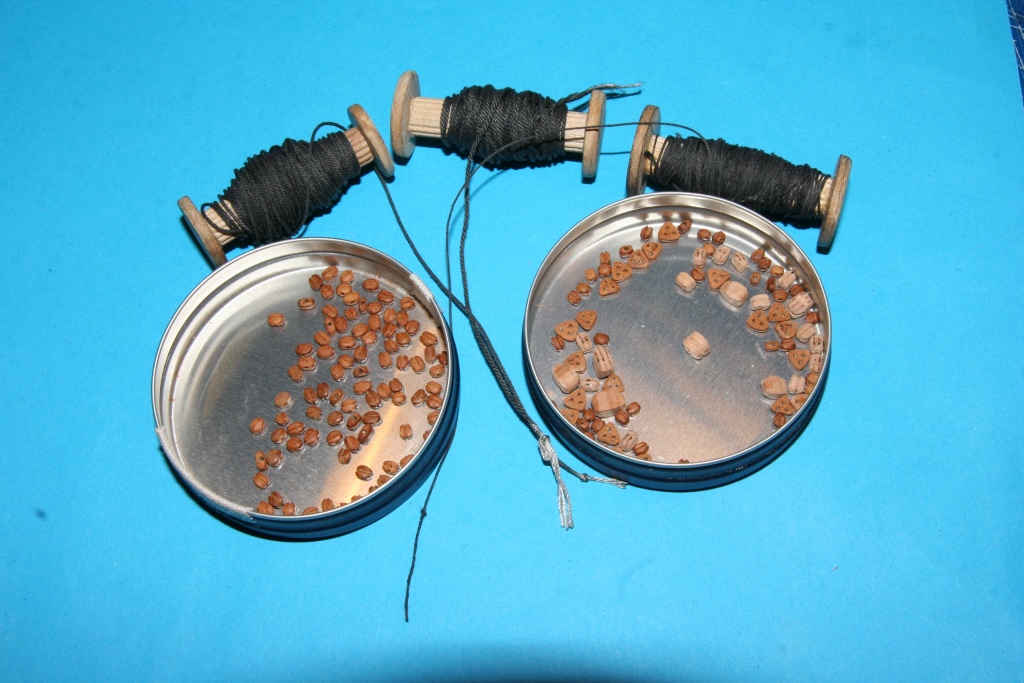 Ostatnie kilka dni to zabawa z bloczkami, jufersami i kręceniem linek. Pojedyńcze bloczki z listewki jabłoni najpierw nawiercane, później szlifowanie (wykonanie pokazane w Ninie). Niestety ta sama technologia okazała się nieprzydatna do bloczków podwójnych i potrójnych, ze względu na problem z utrzymaniem dokładności wiercenia. Zrobiłem je z forniru gruszy i przyznam, że całkiem nieźle wyszły i całkiem szybko się je robiło. Dodatkowo patent na nacinanie rowków. Myślę, że zdjęcia wystarczająco obrazują kolejność prac.