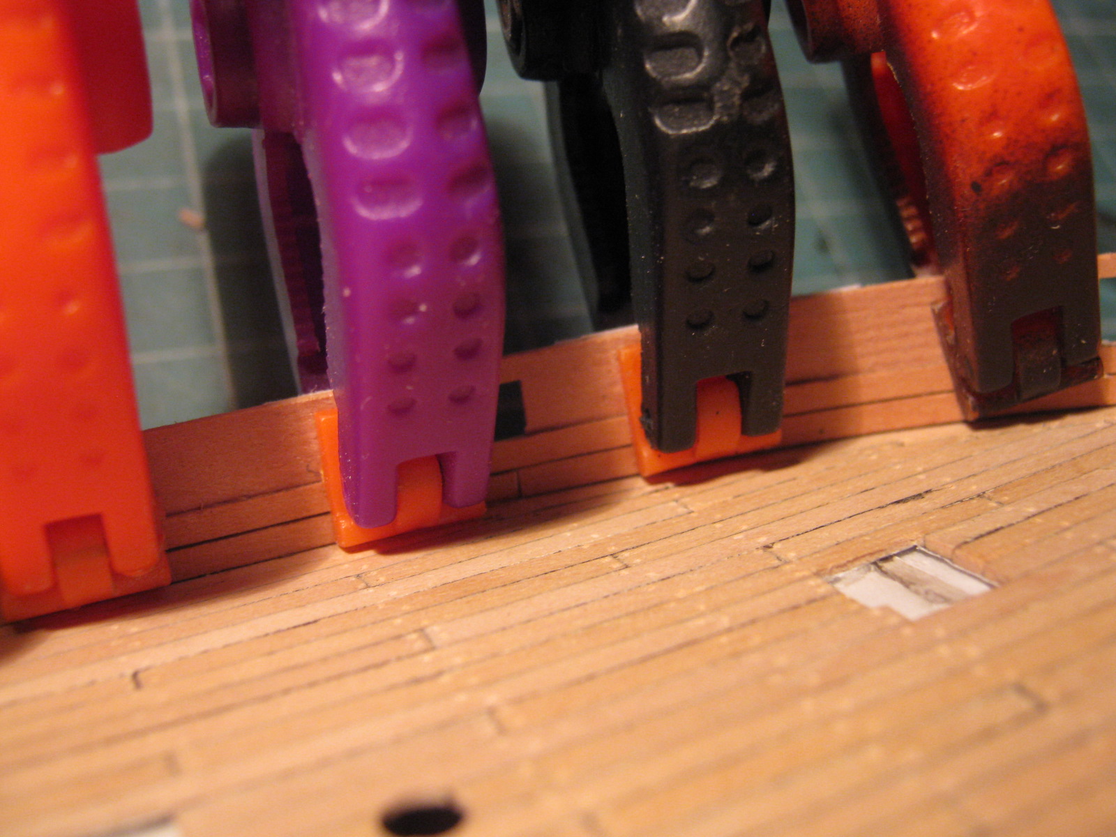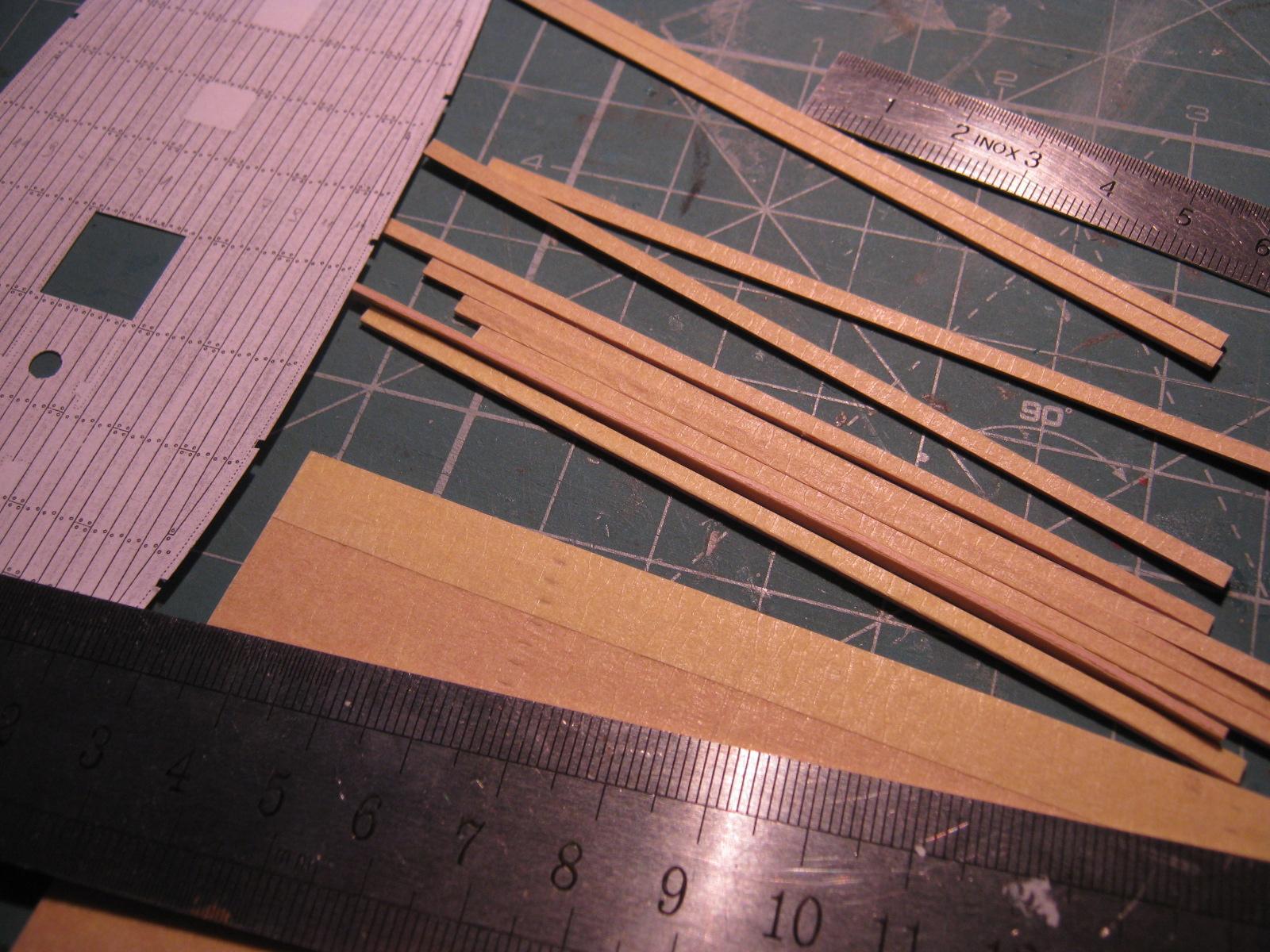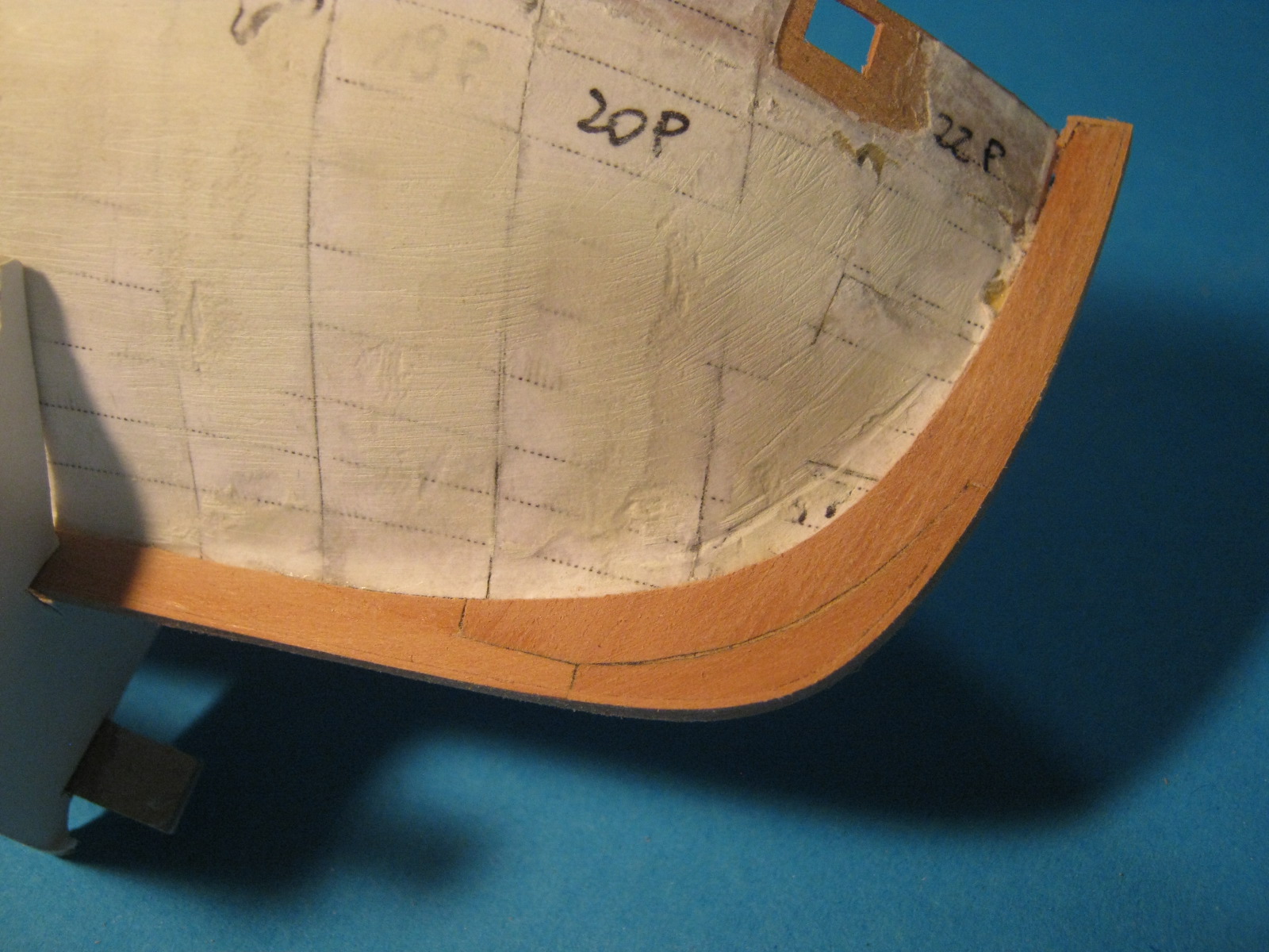 Zrobiłem poszycie nadburcia i wyszlifowałem sobie otwory strzelnicze. Idealne doszlifowanie otworów nastąpi po przyklejeniu poszycia burtowego zewnętrznego.