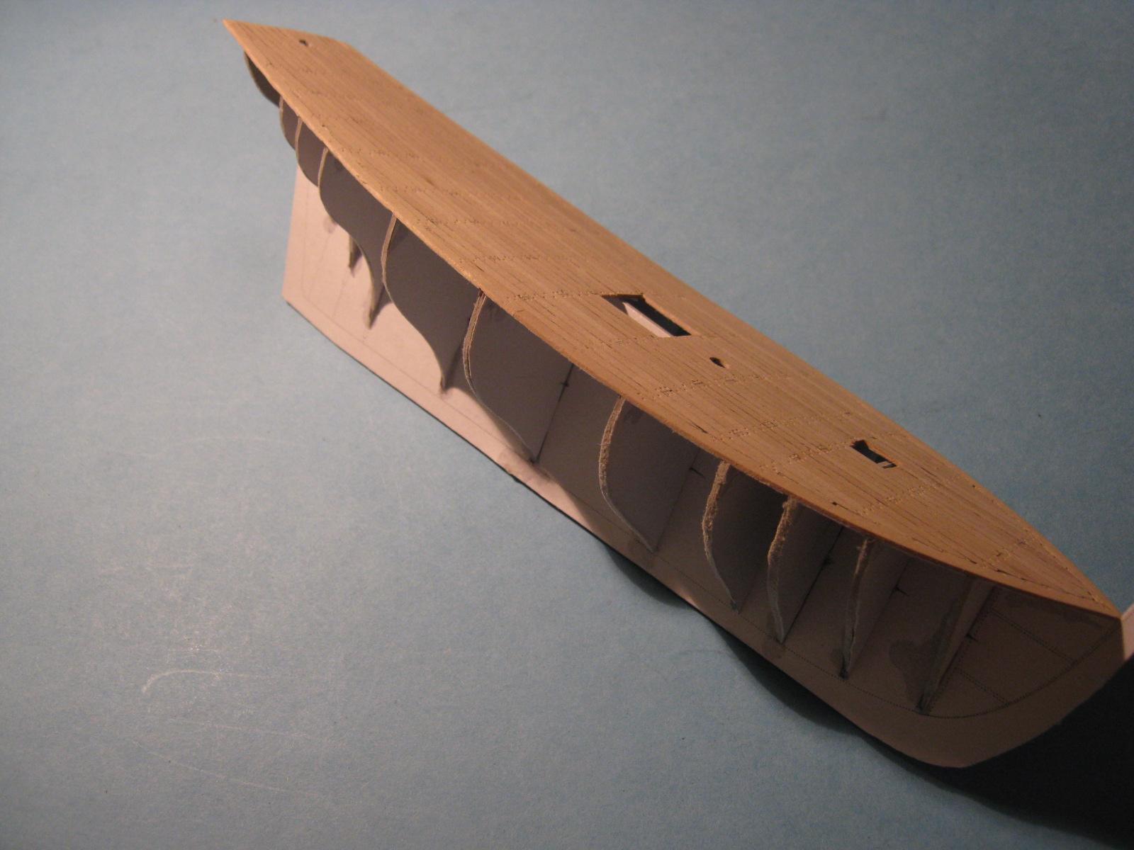 Wzmocniłem nadburcia jednym kawałkiem forniru (ależ ta grusza się chce wyginać!). Musiałem zostawić ten papier żeby mieć się czego złapać przy profilowaniu krzywizn. Teraz ten papier postaram się odkleić albo sfazować żeby był jak najbardziej cienki - taką to sobie technologię wymarzyłem.