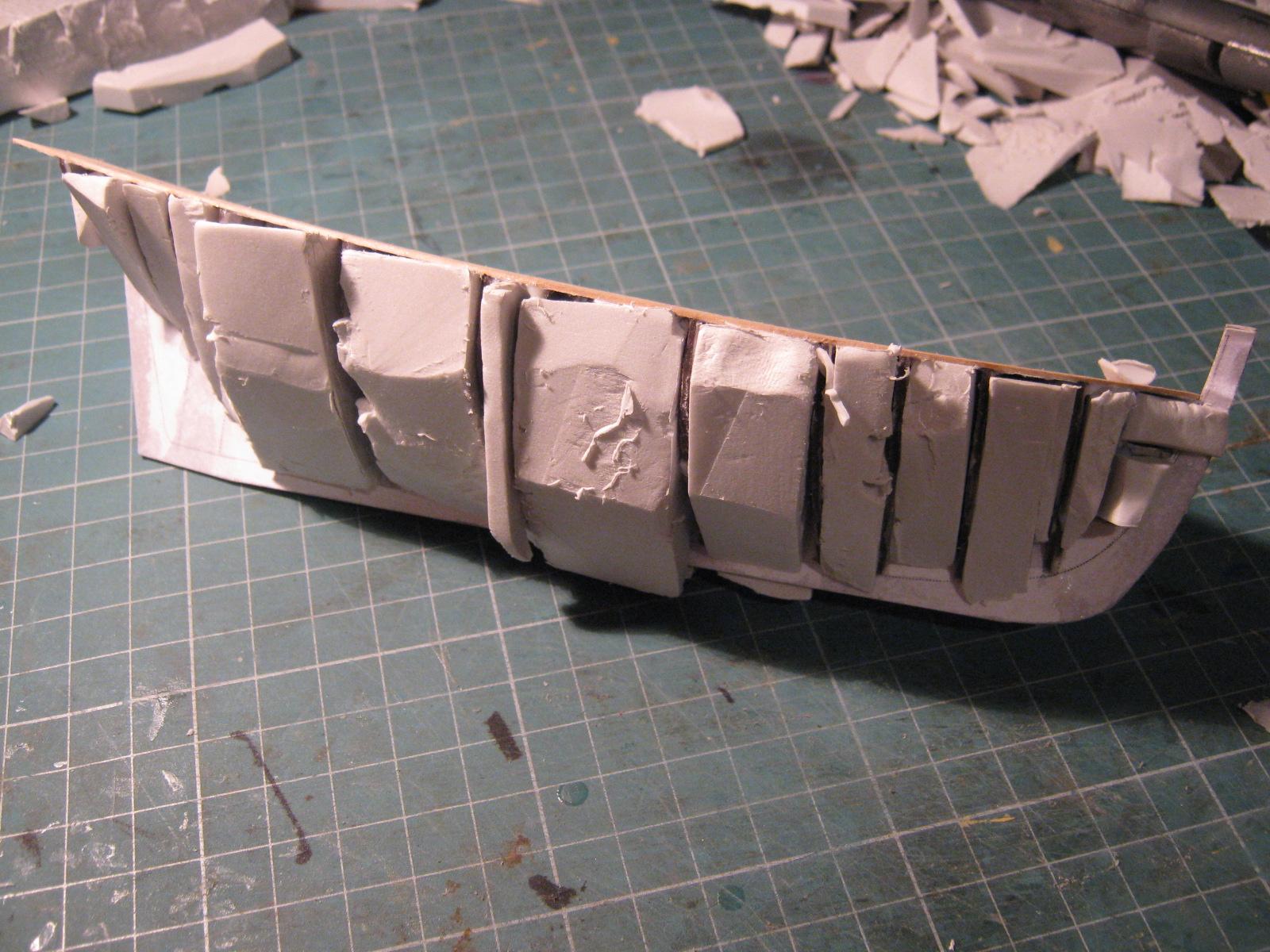 [EDIT]: Nie mogłem kłaść szpachlówki Wamod bezpośrednio na piankę bo szpachlówka ją wyżerała. Na piankę najpierw szła szpachla do drewna, później po oszlifowaniu szpachli warstwa rozrzedzonego wikolu, na to papierowe pierwsze poszycie z wycinanki, które później nasączyłem superglue a na sam koniec na dopieszczenie szpachlówka wamodu.