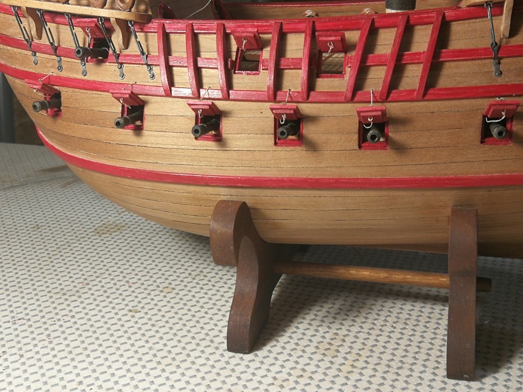 Uzbroiłem armaty na głównym pokładzie w talie i liny hamujące, mam nadzieję że udało mi się choć trochę zbliżyć do wyglądu tych urządzeń. Liczę się z komentarzem i uwagą, że nie ma miejsca pomiędzy armatami a gretingiem na odrzut armaty i ich załadowanie. Wózki armat i gretingi są jednak zgodne z wymiarami w wycinance. Zrobiłem chyba już ostatnie części doklejane do kadłuba czyli kotbelki i w końcu pomalowałem całość olejem 3v3 , czereśniowy fornir nabrał pięknego koloru