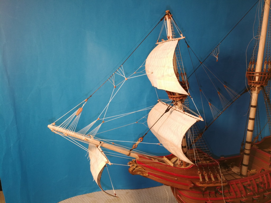 Żagle poszyte i rozpoczęte ich zawieszanie. Wybrałem opcję zawieszania od przodu. W międzyczasie musiałem wymienić kołkownicę na dziobie ze względu na za małą ilość nagli i sukcesywnie dorabiam różnej maści bloczki. potrójne posłużą do windy grotrei i fokrei.