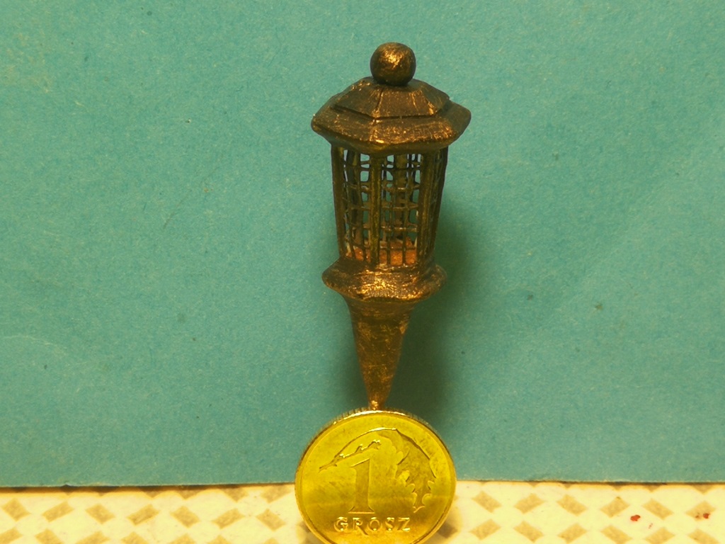 Na miarę swoich możliwości wykonałem latarnię. Ramka z kartonu, imitacja szybek z drobnej siatki. Góra i dół latarni z modeliny i całość pomalowana na czarno plus przetarcie złotolem prawie suchym pędzelkiem.