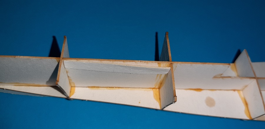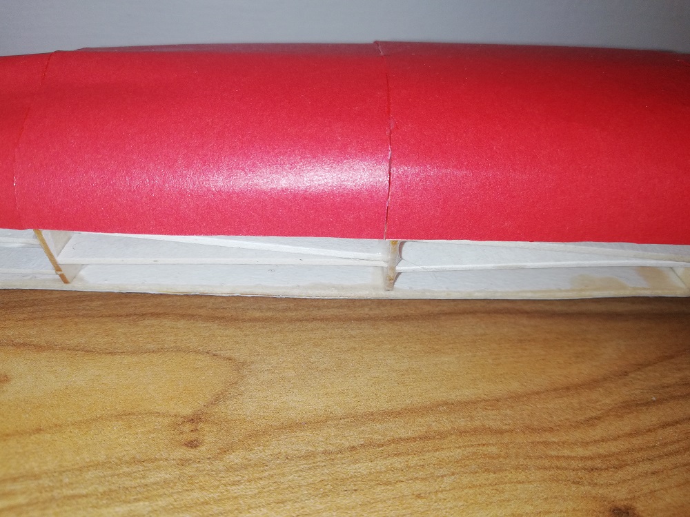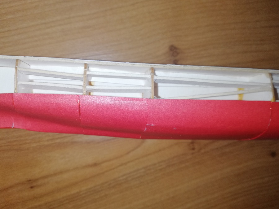 Łączenia poszczególnych segmentów rozjechało się z wręgami - widać przesunięcie łączenia poza krawędź wręg. Nie kładź na przyszłość poszycia bezpośrednio na wręgach - stosuj paski łączące poszczególne oklejki. Zapobiega to klawiszowaniu segmentów. U Ciebie jedna oklejka jest wyżej, druga niżej. Do takich pasków łączących najlepiej nadaje się kalka techniczna - jest cienka i sztywna.