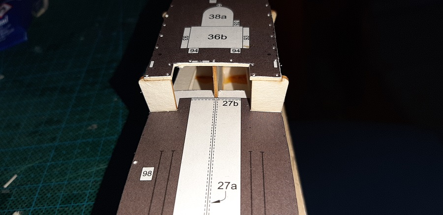 Wkleiłem i wyretuszowałem drzwi. Zacząłem oklejać poszycie denne. Nie jest to ideał, ale jak na 2 poszycie kartonowe myślę, że tragedii nie ma. Zdjęcie jak to zwykło bywać wyszczególniają babole, ale w realu aż tak beznadziejnie to nie wygląda.