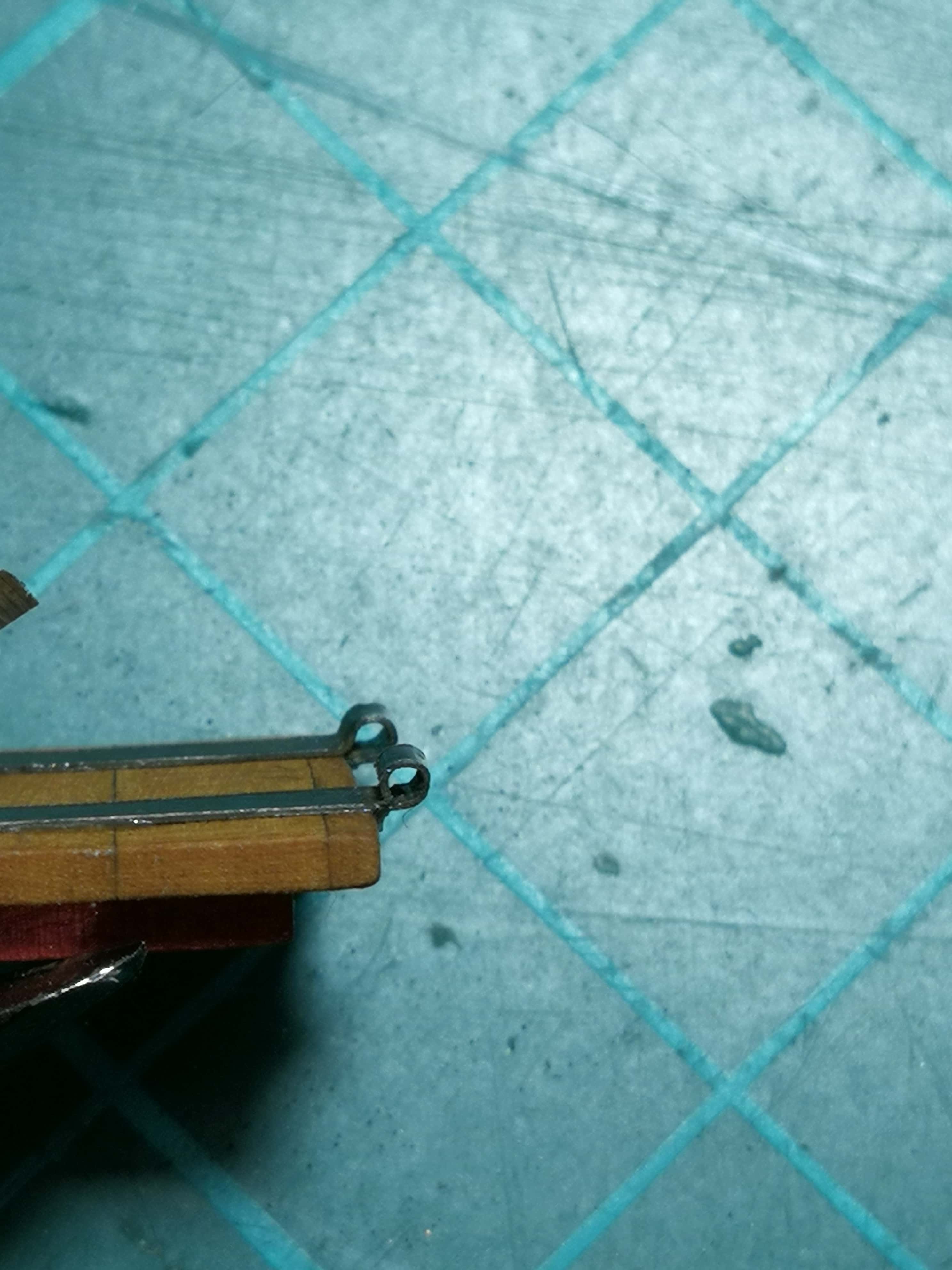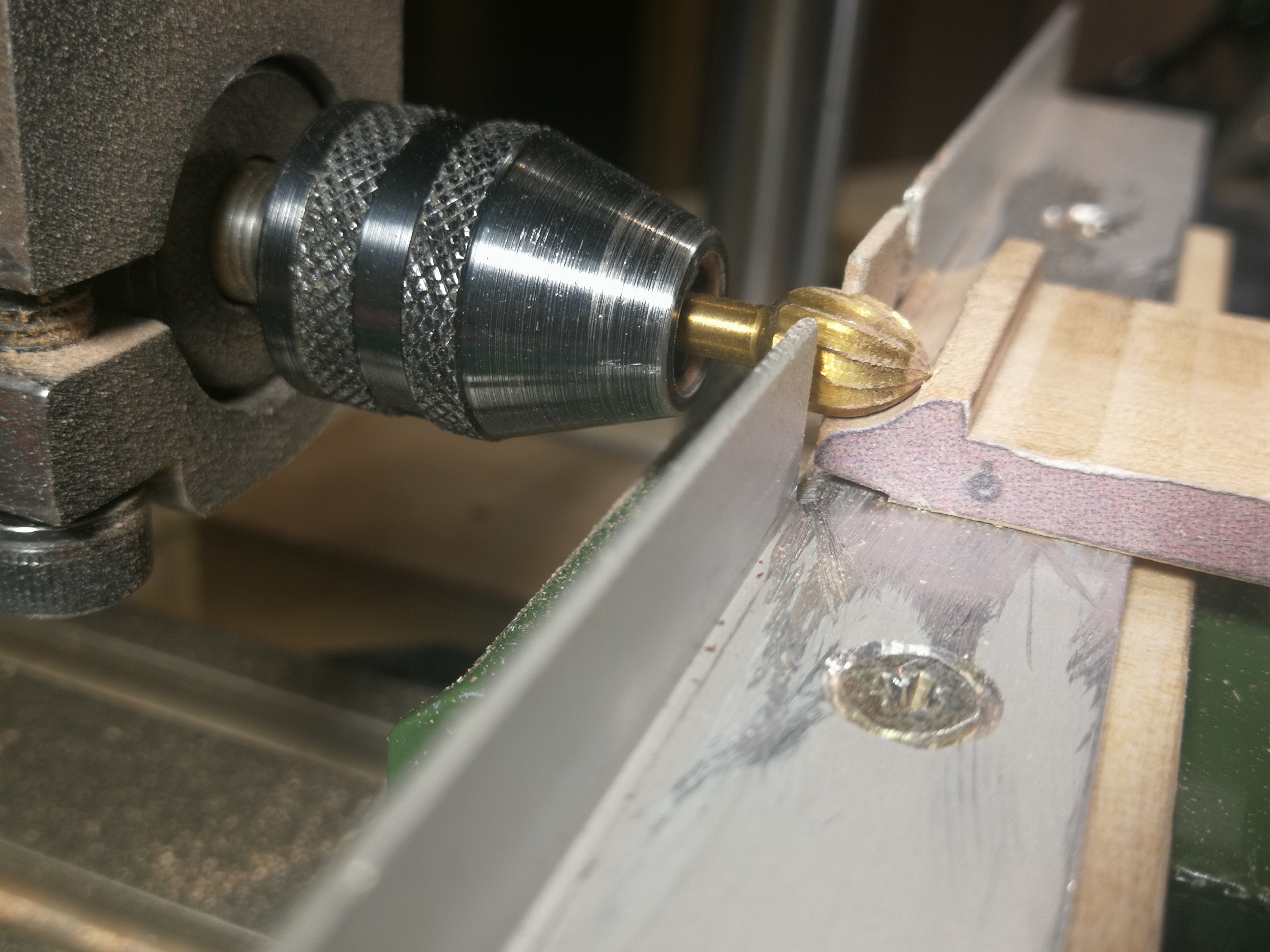 Potrzebne było też kilka knag do zawiązania lin od furt działowych i jeszcze będą potrzebne przy masztach wiec zrobiłem hurtem z kilkadziesiąt szt. Listewka frezowana w poprzek włókien tak żeby po pocięciu układ włókiem w knadze był wzdłużny. Oczywiście na koniec pilniczek, złamanie krawędzi nadanie ostatecznego kształtu.