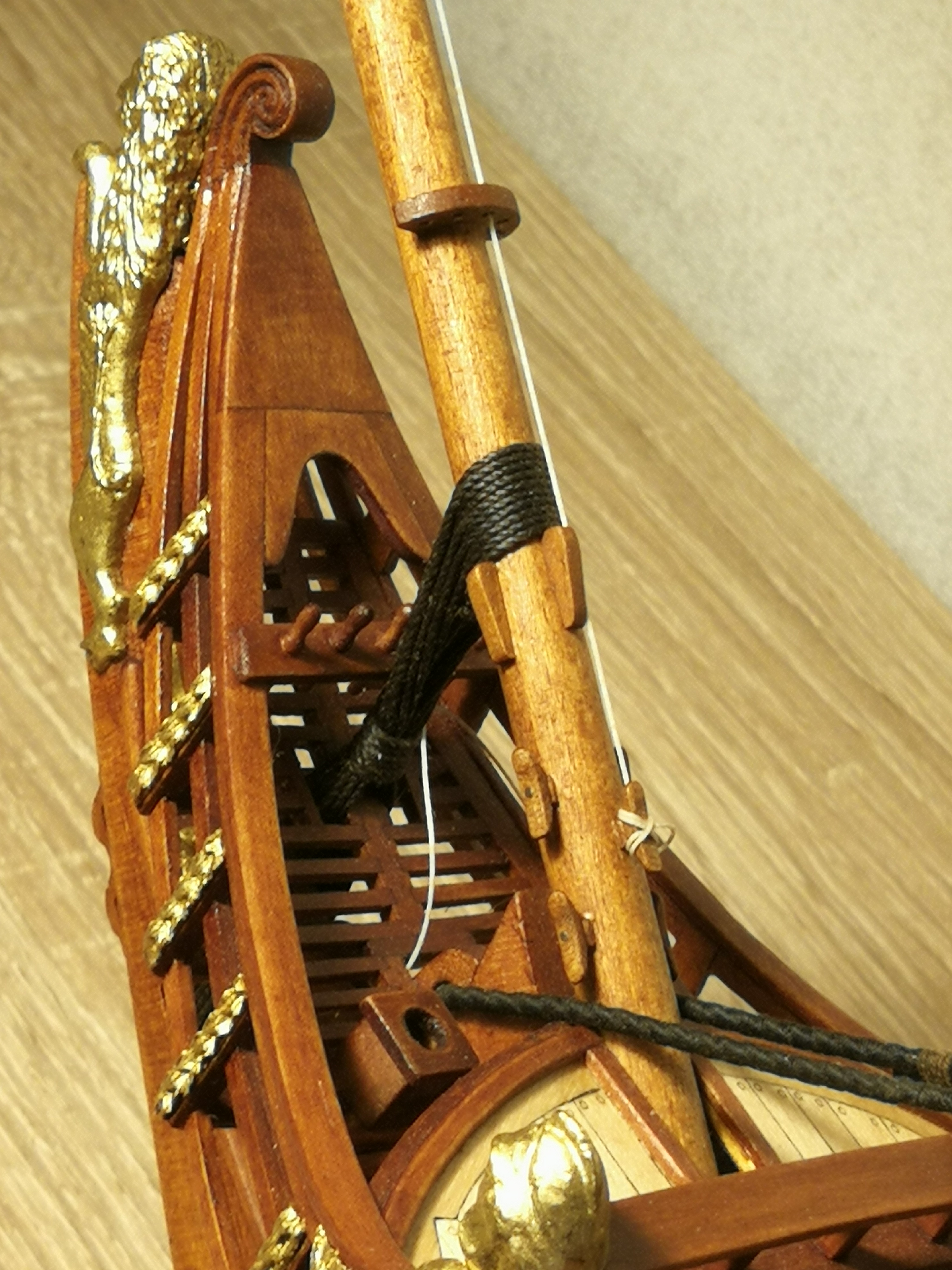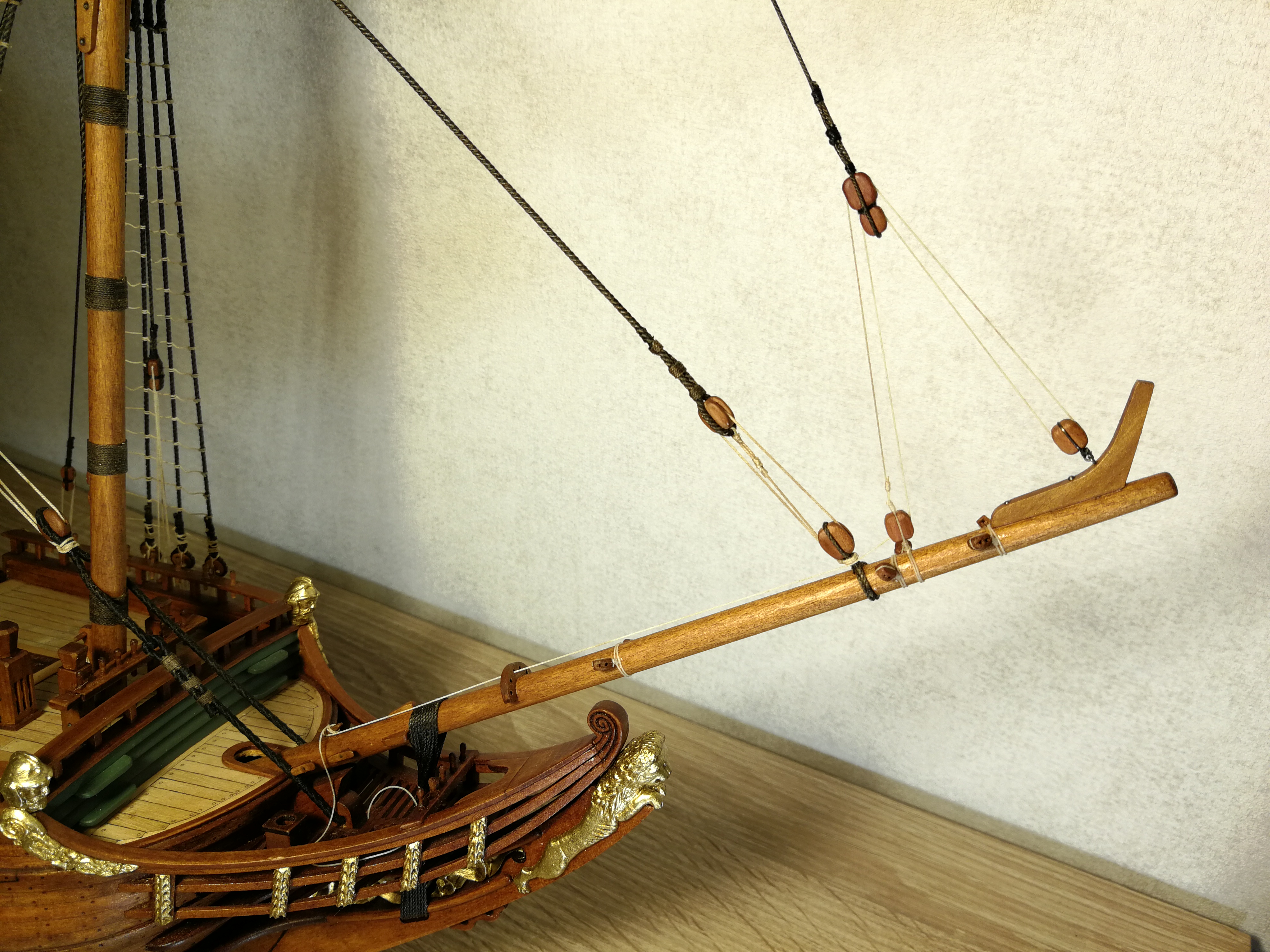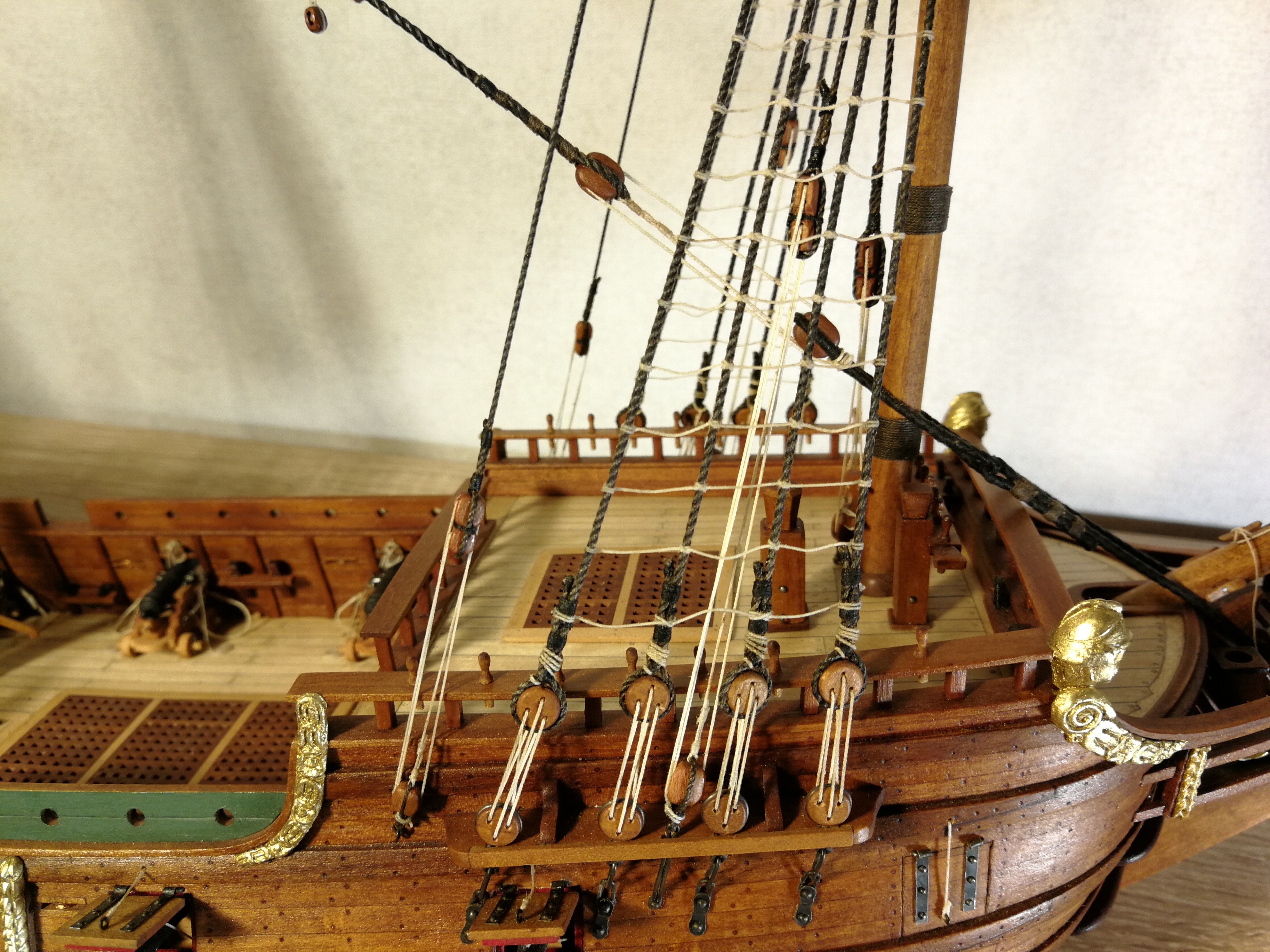 Maszty i olinowanie stałe skończone. Musiałem dorobić jeszcze z kilkanaście szt bloczków wiolinowych.
