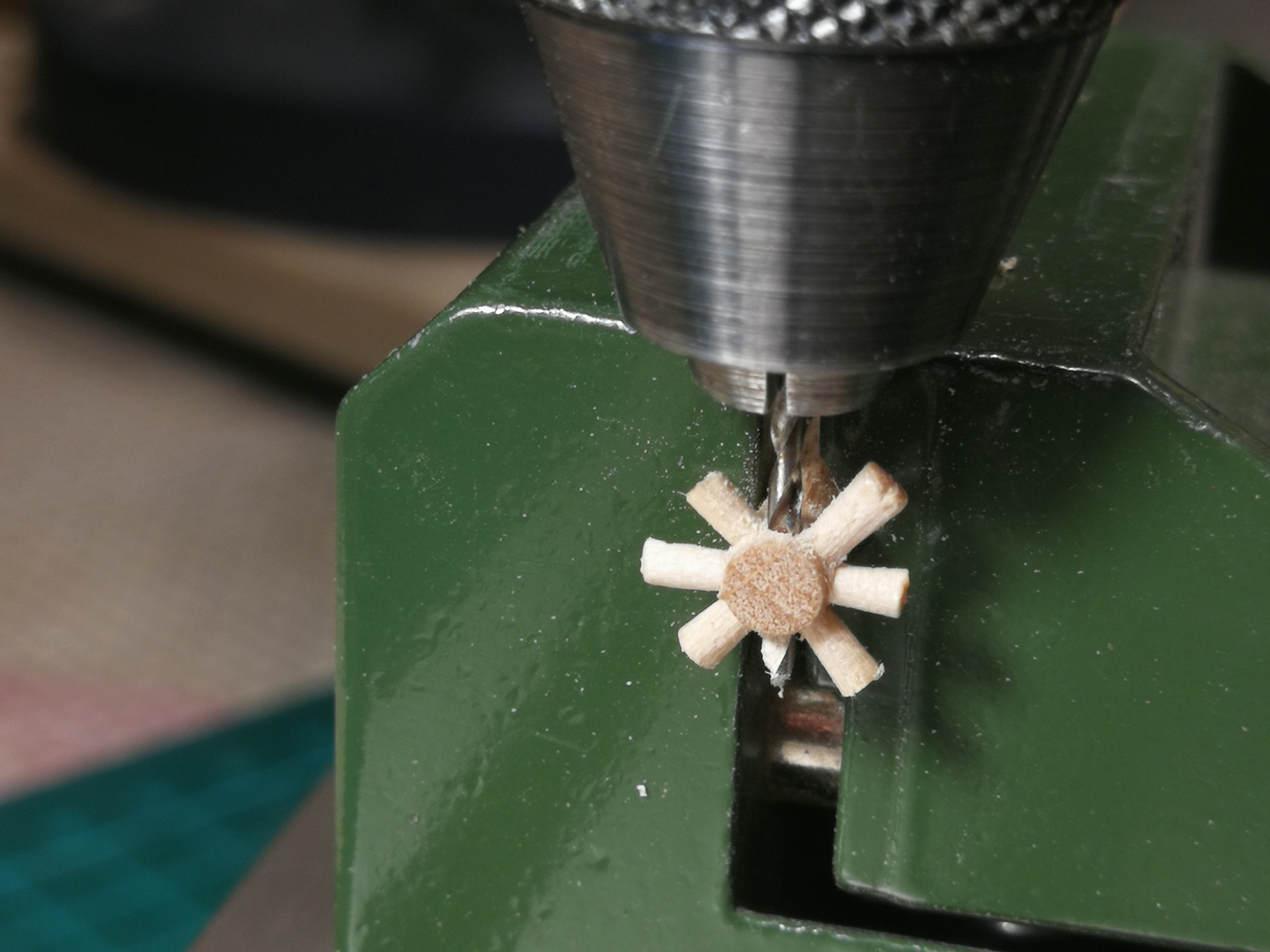 Pierścienie na lufach szrotownic zrobiłem z opaski termokurczliwej. Obręcze kółek to zawinięty i sklejony podwójnie fornir 0,6mm. Trochę nakombinowałem się przy zrobieniu piasty ze szprychami ( czy jak to nazwać ) ale ostatecznie efekt końcowy jak dla mnie ok.
