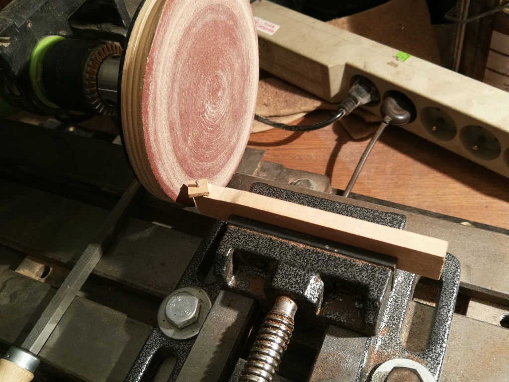 W zasadzie cała filozofia pokazana jest na zdjęciu. Ucięty wkręt wrkecony i wklejony na CA w kołek bukowy. Docisk frezowałem, ale kolejne zrobię z prostej listewki i tylko podkleję w razie potrzeby te stopki.