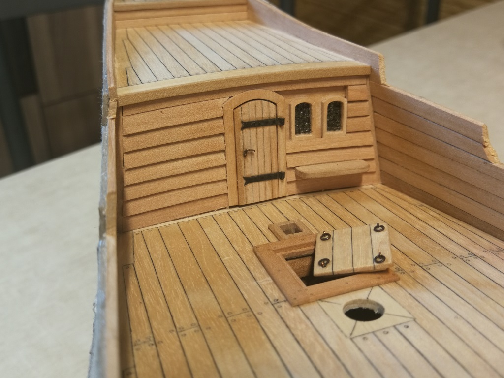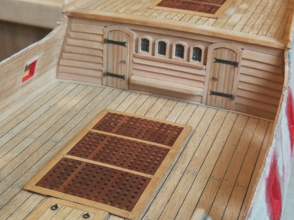 Armaty umieszczone pod pokładami i zamocowane na linach odrzutowych. Burty od wewnątrz wydeskowane. Gretingi na razie przymierzone "na sucho" jeszcze powędrują do pudełka.