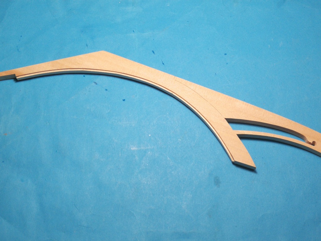 Pierwszy raz poszywam kadłub listewkami z gruszy ( wcześniej bawiłem się z formirem ) Zdecydowanie na plus łatwość wyginania listewek. Większe łuki części dziobowej kształtuję żelazkiem parowym - bardzo łatwo podoginać jak tylko potrzeba. Postanowiłem również, że zacznę od przyklejenia stewy dziobowej z wykonanym rowkiem, tak aby łatwo spasować listwy na dziobie. Rowek nie jest frezowany, wkleiłem od wewnątrz węższą listwę. Listwy dociskam wykonanymi wcześniej przydaśkami jak na zdj. Bardzo pomocne okazuje się wcześniejsze wypełnienie przestrzeni pomiędzy wręgami drewnem. Jest do czego porządnie dokręcić docisk.