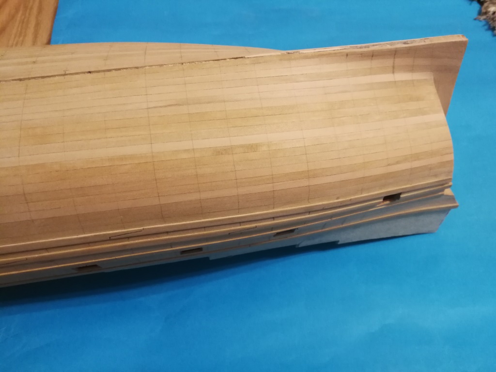 Poszywanie kadłuba powoli dobiega do końca. Ostatnie kilka planek biegnie po stewie rufowej, dlatego wkleiłem ją przed zakończeniem poszywania. W miejscu gdzie biegną planki oczywiście musiała zostać pocieniona.