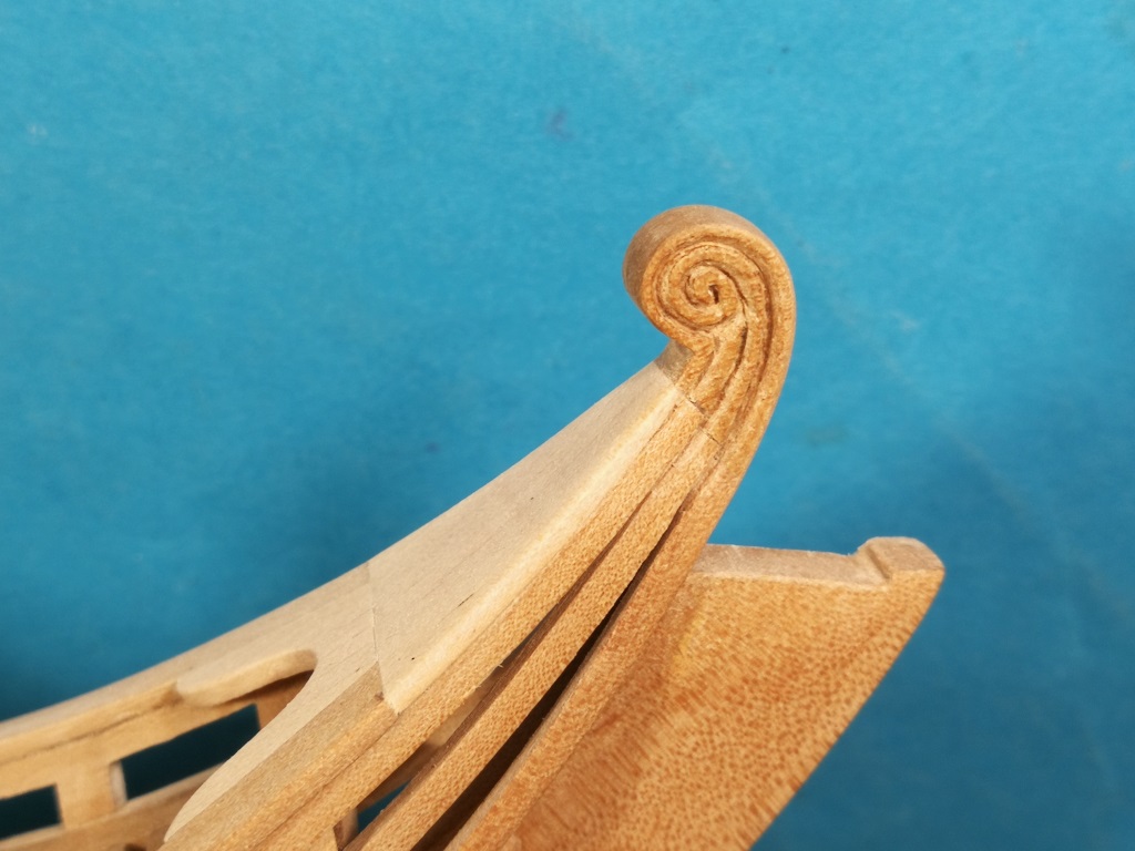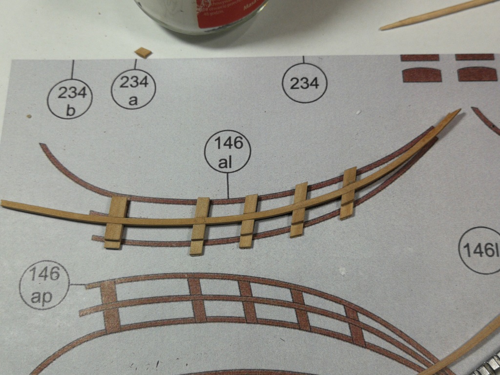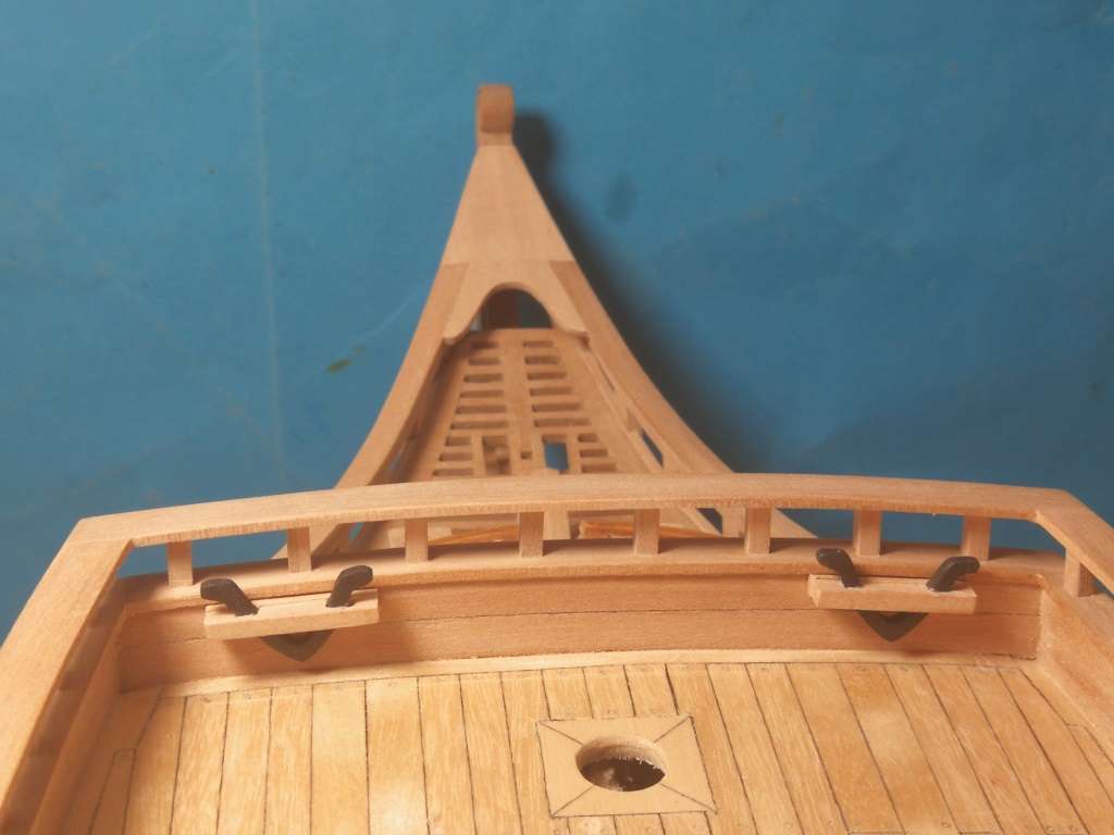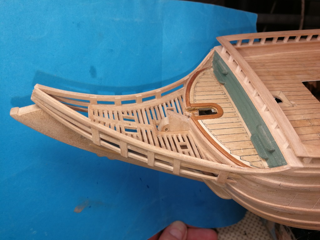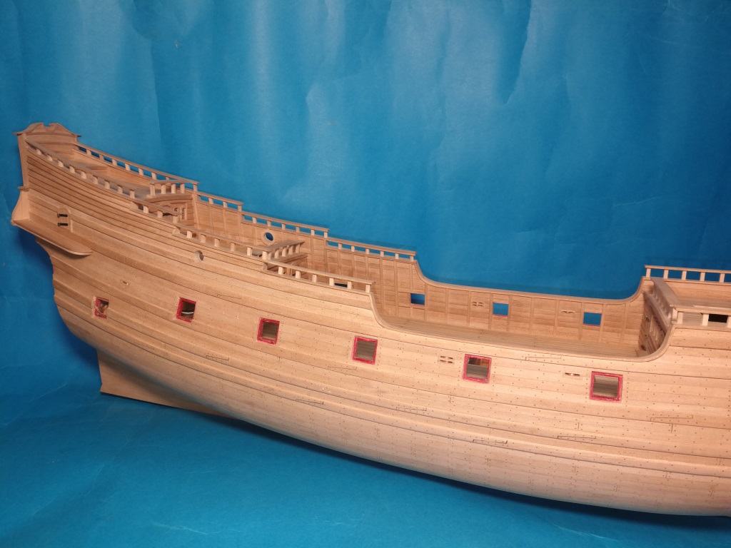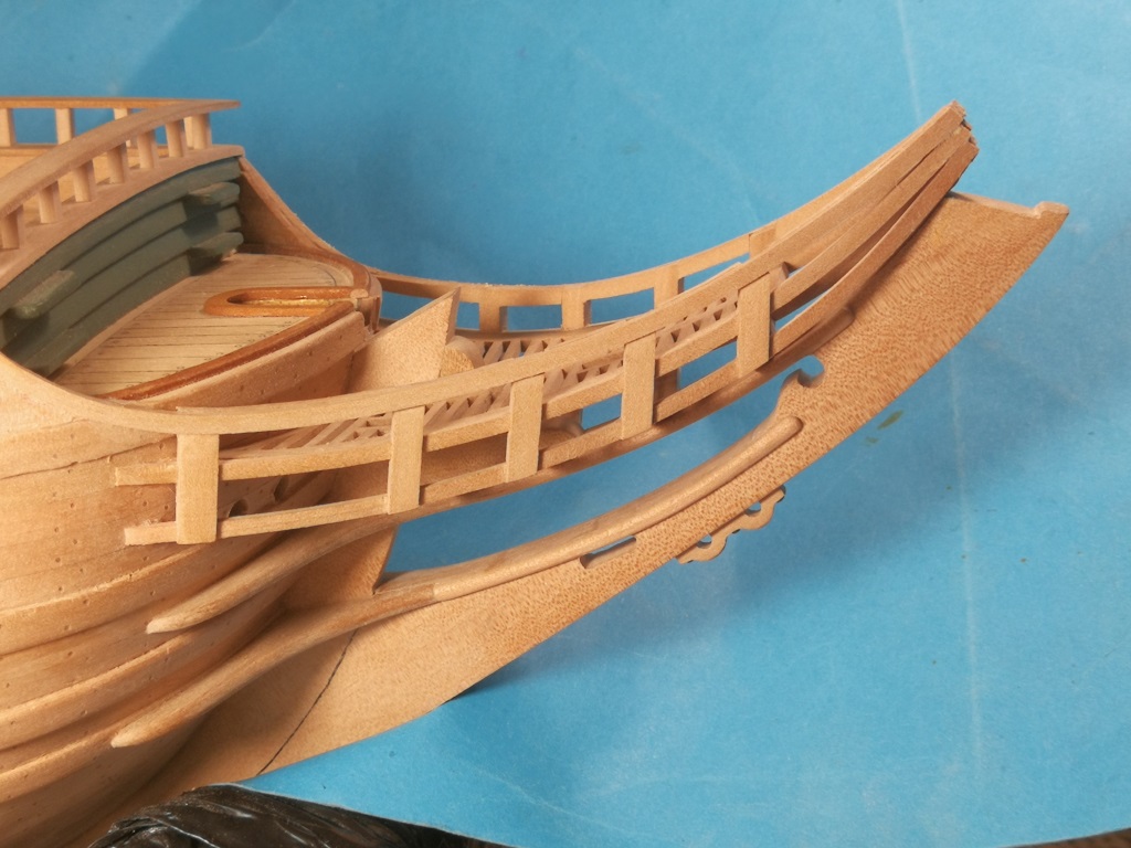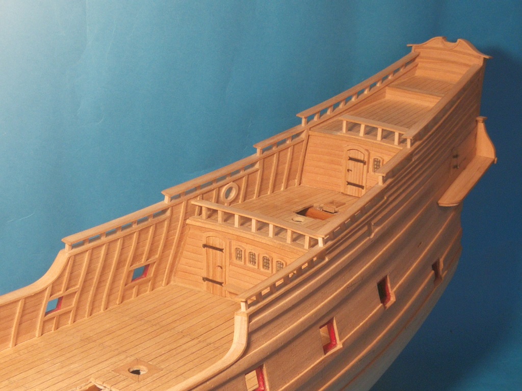 Poprzyklejałem na rufie brakujące wzmocnienia i listwy ozdobne, półkę galerii rufowej i drzwiczki. Powoli całość zaczyna nabierać kształtów.