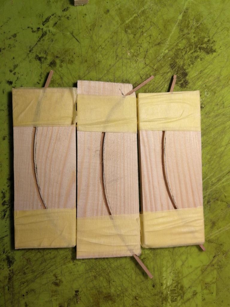 Do wygięcia listewek użyłem rozciętych deseczek zgodnie z ich kształtem. Namoczone i ściśnięte wysuszyłem suszarką i pozostawiłem do następnego dnia.