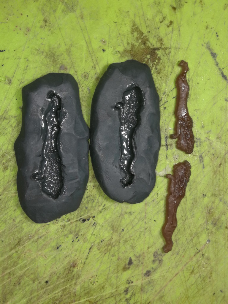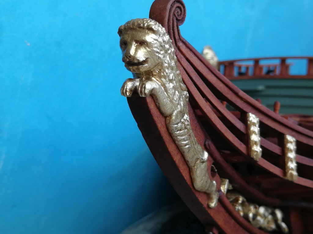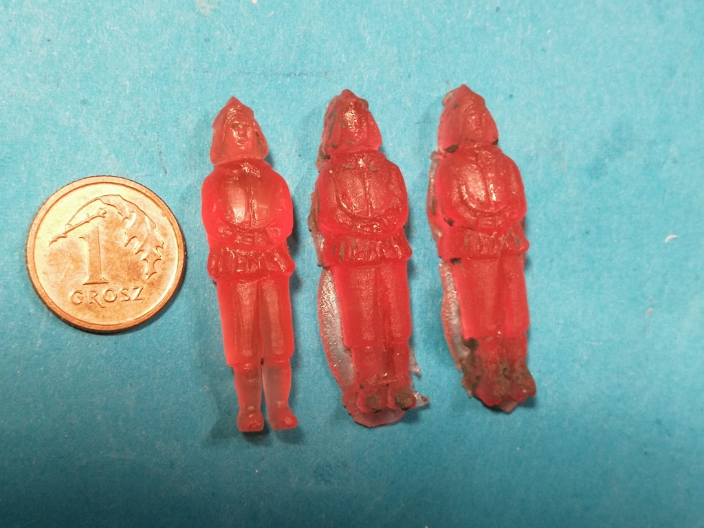 Tym razem rozpocząłem od wycięcia wzoru lwa z papieru i wydrążyłem go w plastelinie, wciskając w nią ten wzór. ( oczywiście lewą i prawą stronę ). Pierwsze zgrubne odlewy z żywicy obrabiłem szlifierką i pilniczkami. Następnie powstawały kolejne odlewy na bazie porzednich ze stopniowym korygowaniem wczeniejszych braków w odlewach. Na koniec sklejenie obu połówek i dopasowanie na swoje miejsce.