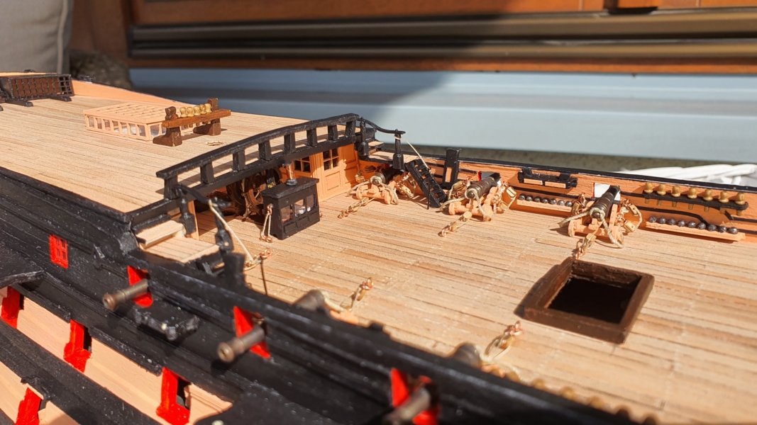 Naktuz już na swoim miejscu. Umieściłem też 6 armat na quarterdecku oraz barierkę na górnym pokładzie.