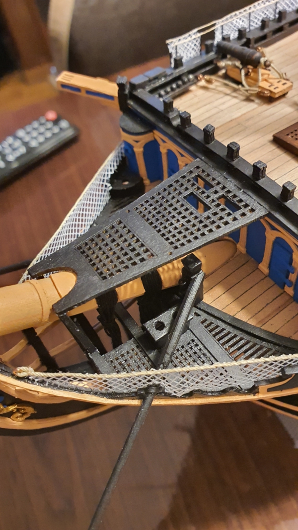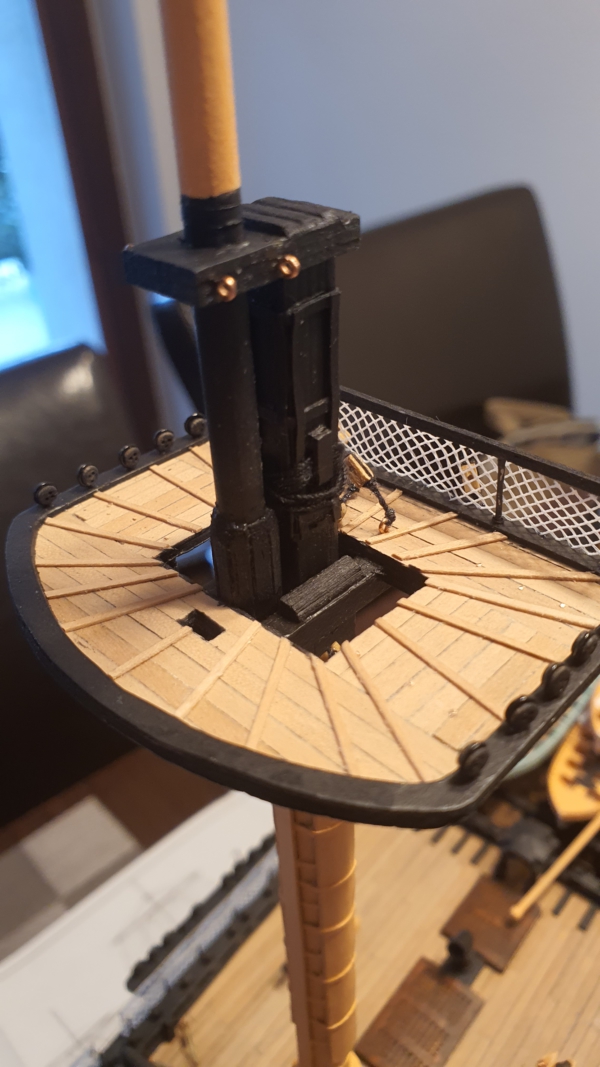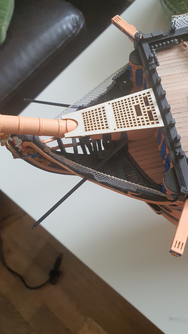 Został jeszcze pomost przy bukszprycie. Niestety, element z wycinanki odbiega kształtem od tego narysowanego w Anatomy (brak otworów na grotsztag), więc zrobiłem swoją wersję, z otworami. Kolega wyciął mi to na laserze i tak oto prezentuje się na okręcie.