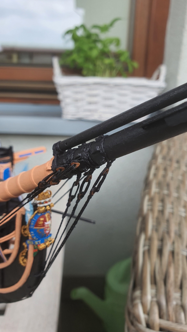 Wykonałem olinowanie stałe bukszprytu, sztagi i wanty to nić 0,7mm. Serca 4mm z kartonu