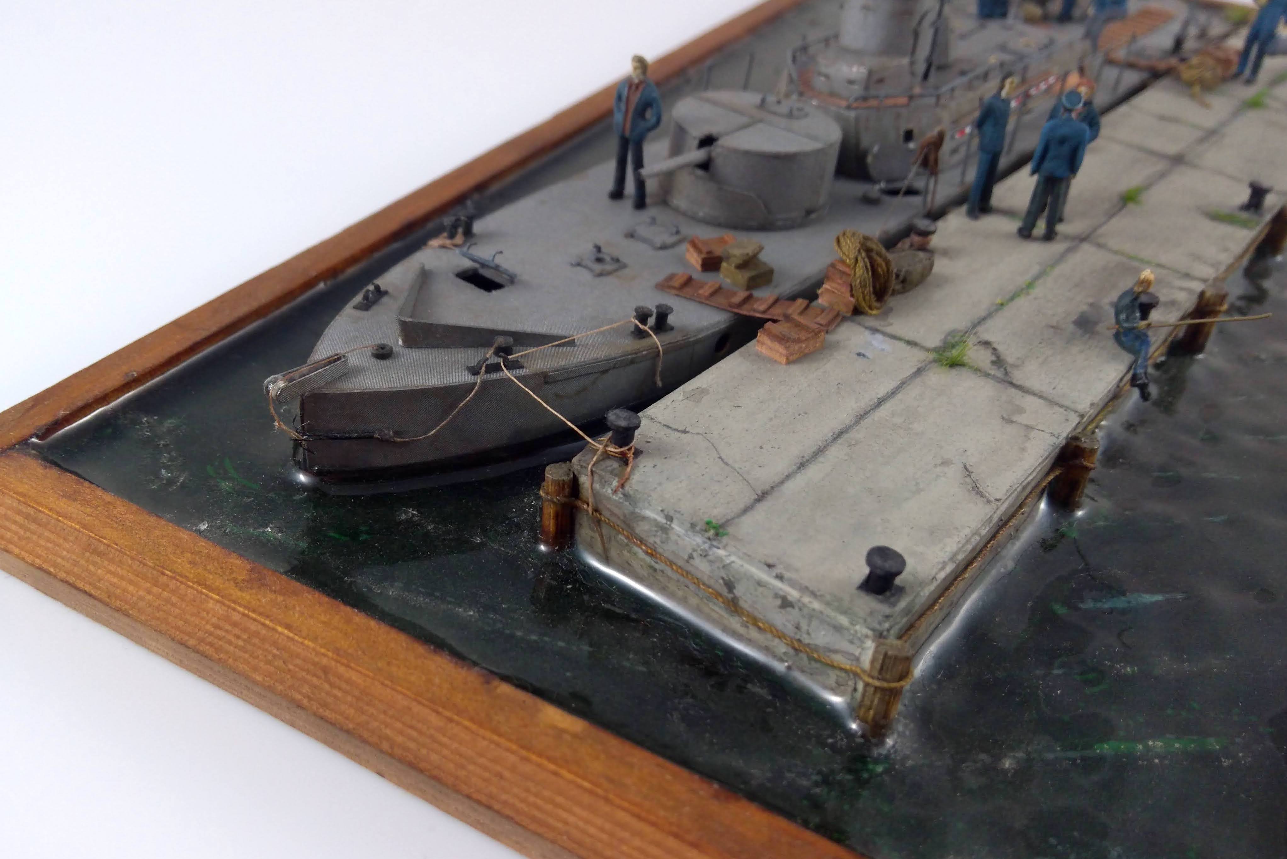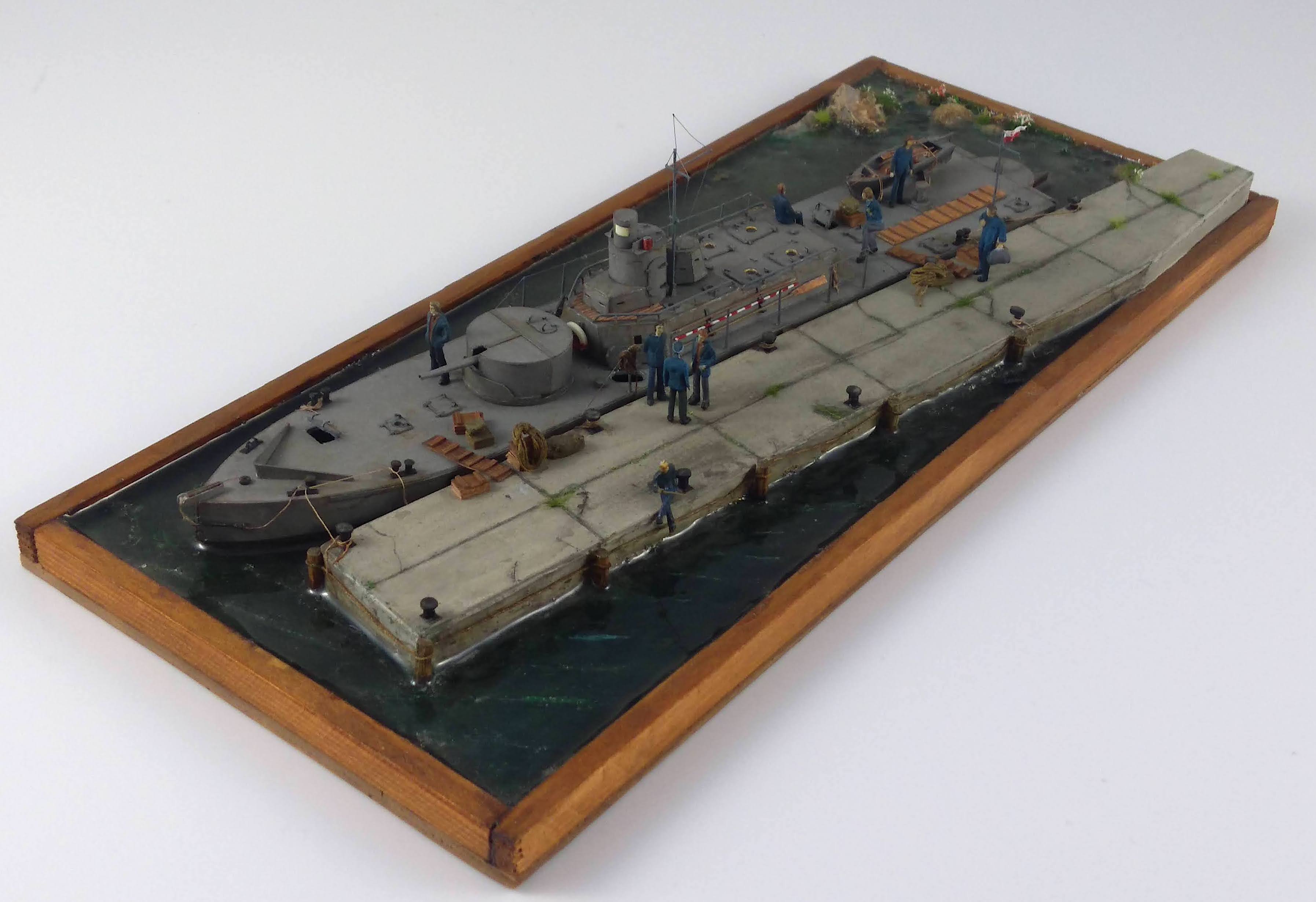 Teraz o samym modelu i dioramce. Tak sobie to wyobraziłem, ORP Nieuchwytny przy nabrzeżu i z załogą. Woda to żywica epoksydowa. Figurki zakupione białe i malowany. Zapraszam do oglądania.