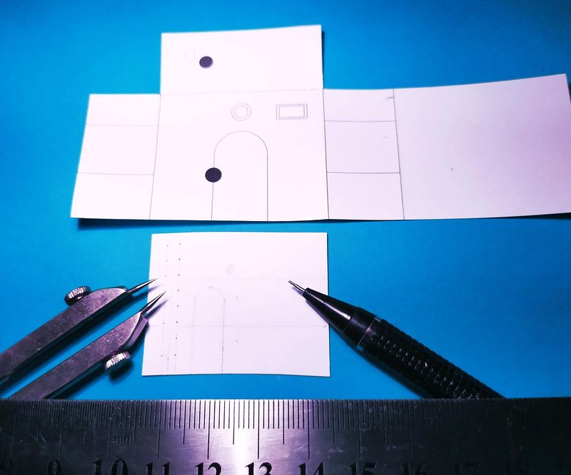 Poszycie burty wykonałem od nowa z brystolu. Obniżyłem linię wodną (wytyczyłem ją widocznym na zdjęciu przyrządem) i przy okazji zmieniłem układ iluminatorów.