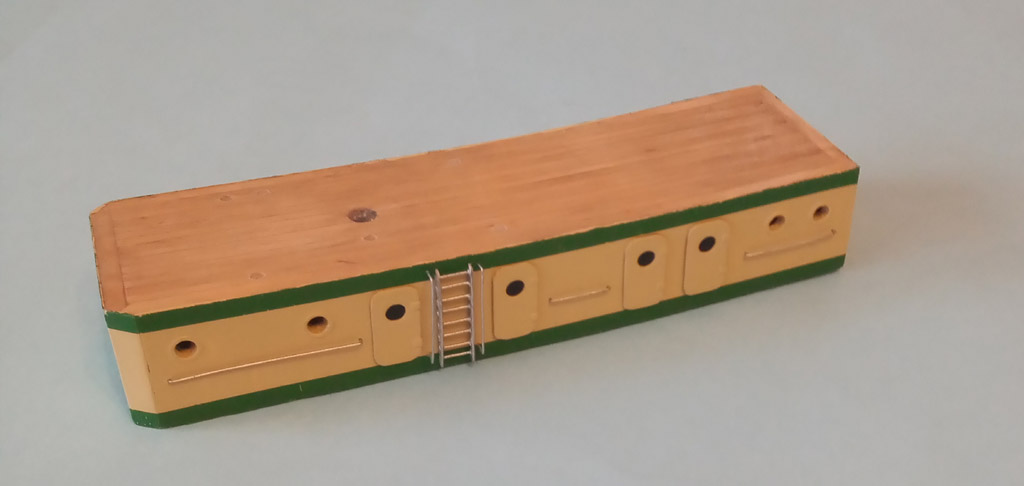 Kadłub pryśnięty podkładem i w takim kolorze chyba zostanie ( zielony kolor części podwodnej trochę mi nie pasuje) . Burta nad linią wodną będzie biała ale do tego jeszcze trochę czasu minie. Nadbudówka zrobiona ,trzeba dalej działać