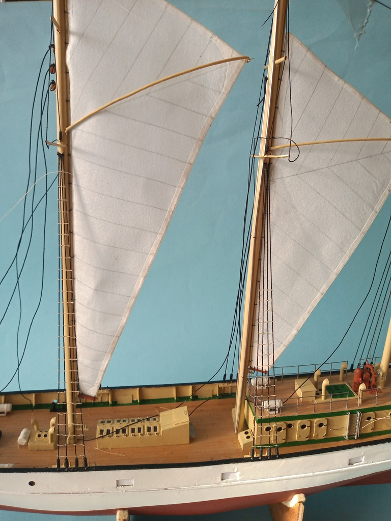 Ostatnio brakuje mi czasu ale udało się zrobić żagielki . Upaprałem też kadłub nad linią wodną na biało . Zastanawiam się czy zrobić zielony pasek na styku białego i podwodnej części .