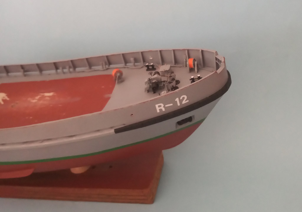 Coraz drobniejsze elementy to wolniej przybywa . Trochę pobawiłem się się z odbojnicami i upaprałem kadłub .Przetarcia na kadłubie będa retuszowane na koniec . Nadbudówka postawiona tylko do fotki