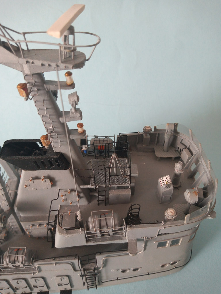 Nadbudówka zamocowana . Przybyło trochę drobnicy - anteny , działko wodne itp . Jeszcze trochę drobnicy i będzie finał