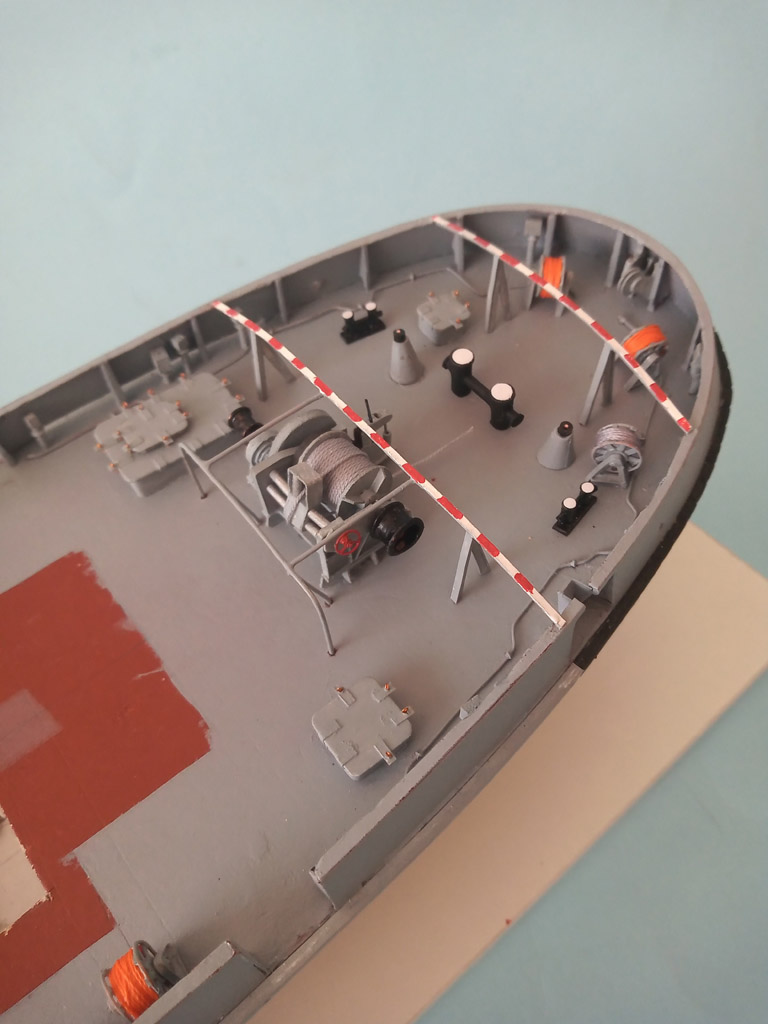 Coraz drobniejsze elementy to wolniej przybywa . Trochę pobawiłem się się z odbojnicami i upaprałem kadłub .Przetarcia na kadłubie będa retuszowane na koniec . Nadbudówka postawiona tylko do fotki