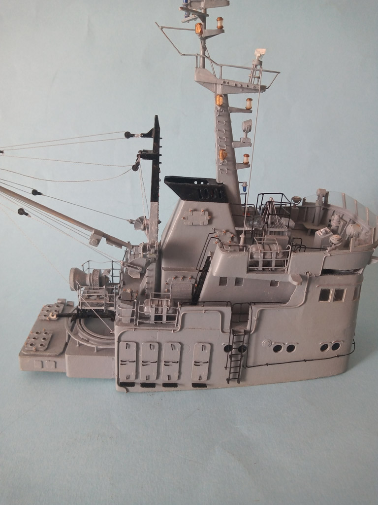 Nadbudówka zamocowana . Przybyło trochę drobnicy - anteny , działko wodne itp . Jeszcze trochę drobnicy i będzie finał