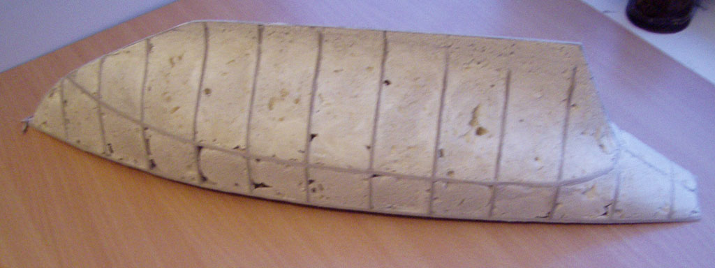 kadłub oklejony papierem gazetowym . Po wyschnięciu zaszpachlowany i odstawiony do schnięcia . Udało się ulepić trochę elementów na pokład do następnego spotkania