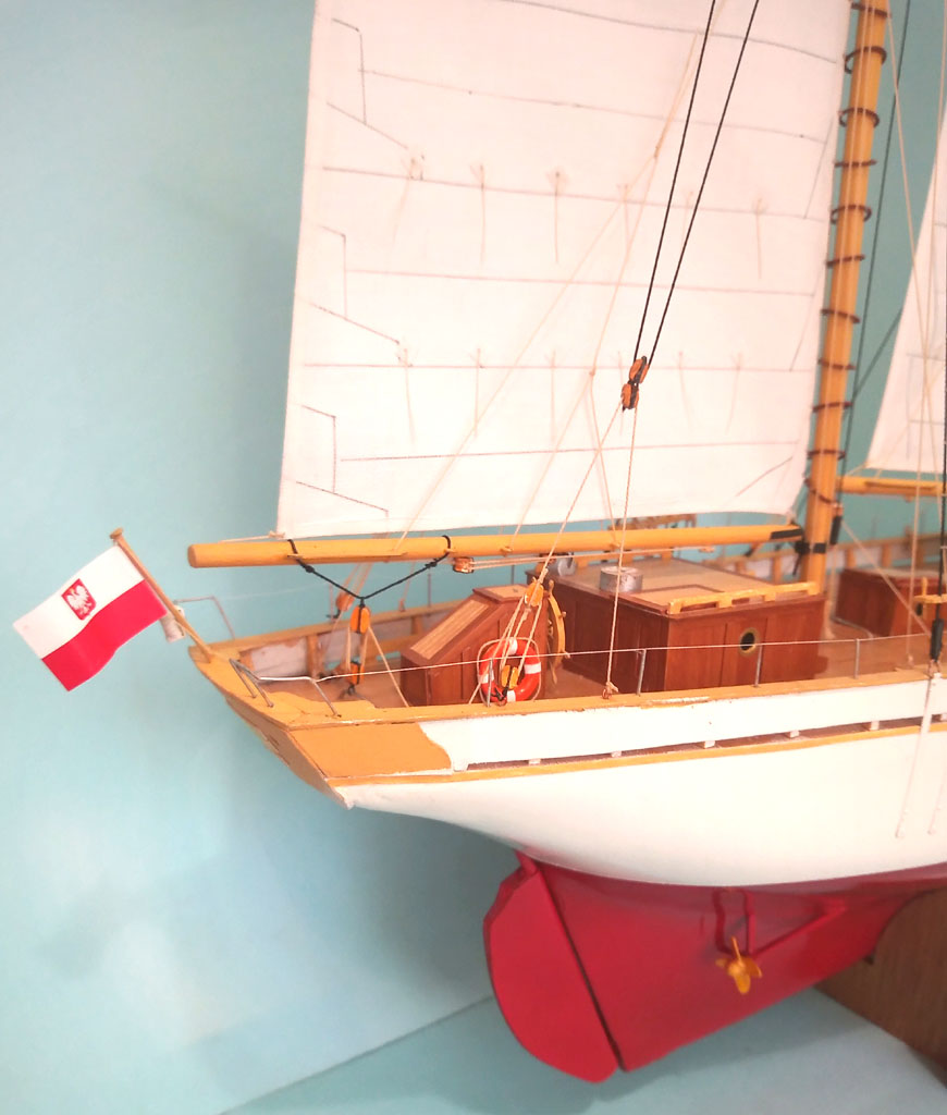 Kolega Janusz w tym roku skończył budowę Zaruskiego ale w wersji pływającej. Ładnie pływa na żaglach ale przy słabym wietrze zwroty wspomaga silnikiem. Zbudował specjalny wózek do wodowania i pobierania modelu z wody.
