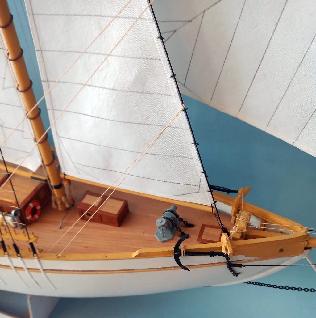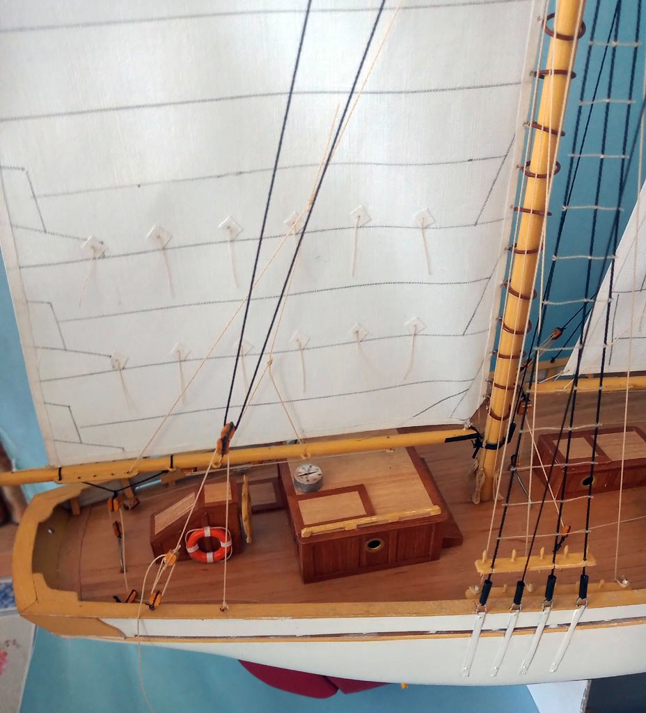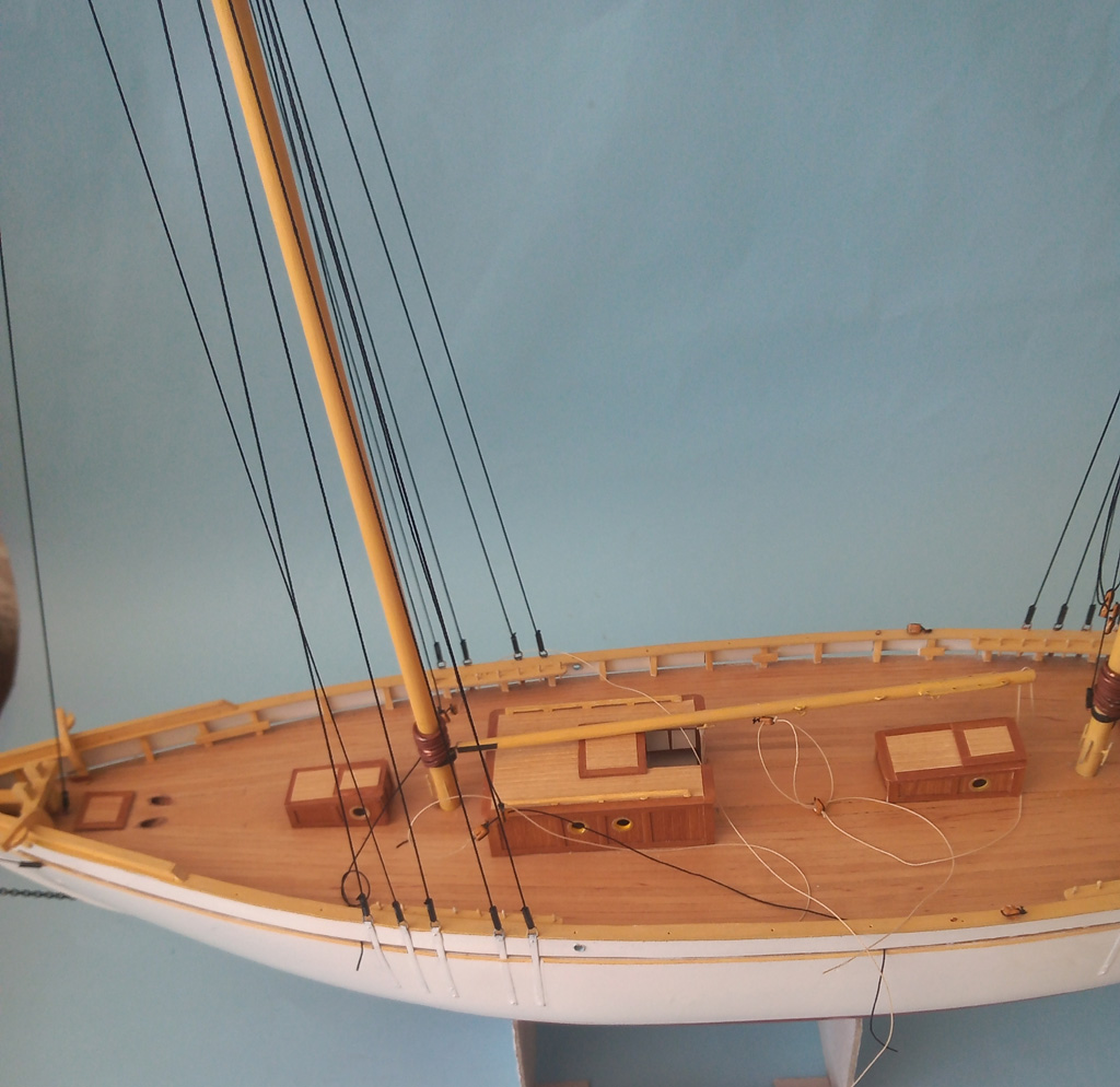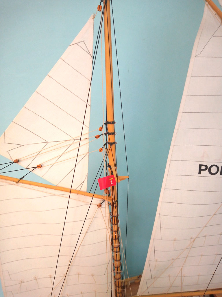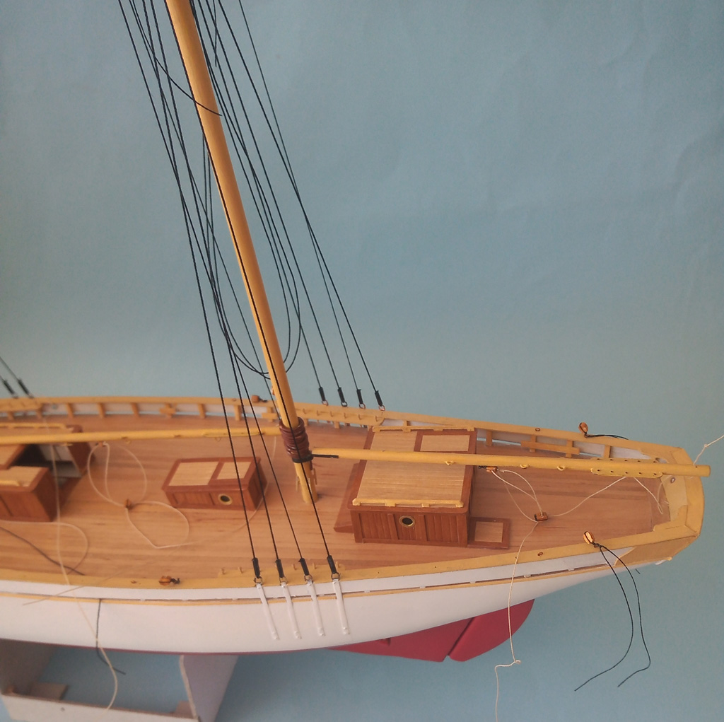 Maszty udało się postawić i zrobić część olinowania stałego . Zrobiłem dwa żagielki które musze uzbroić w bloczki przed zamocowaniem do masztów