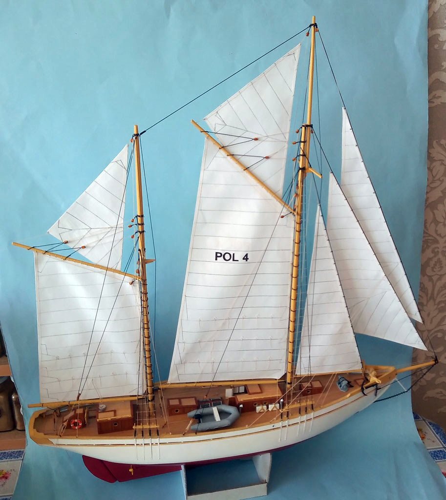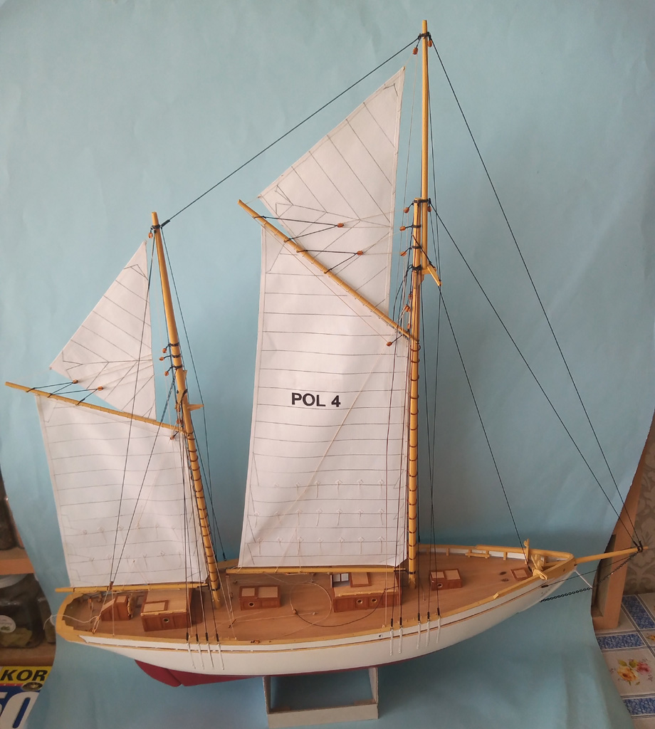 Kolega Janusz w tym roku skończył budowę Zaruskiego ale w wersji pływającej. Ładnie pływa na żaglach ale przy słabym wietrze zwroty wspomaga silnikiem. Zbudował specjalny wózek do wodowania i pobierania modelu z wody.