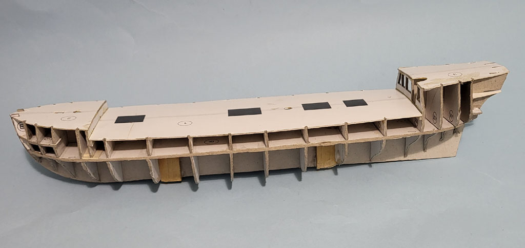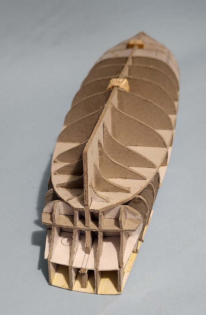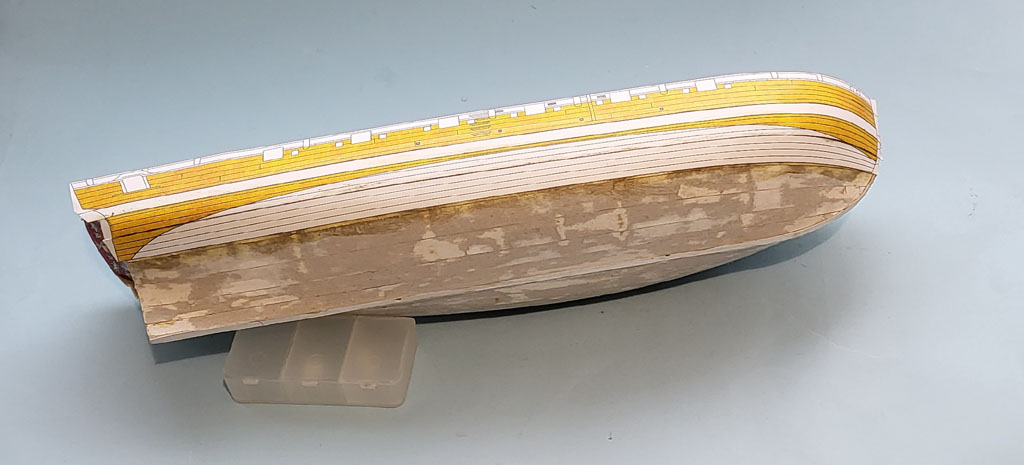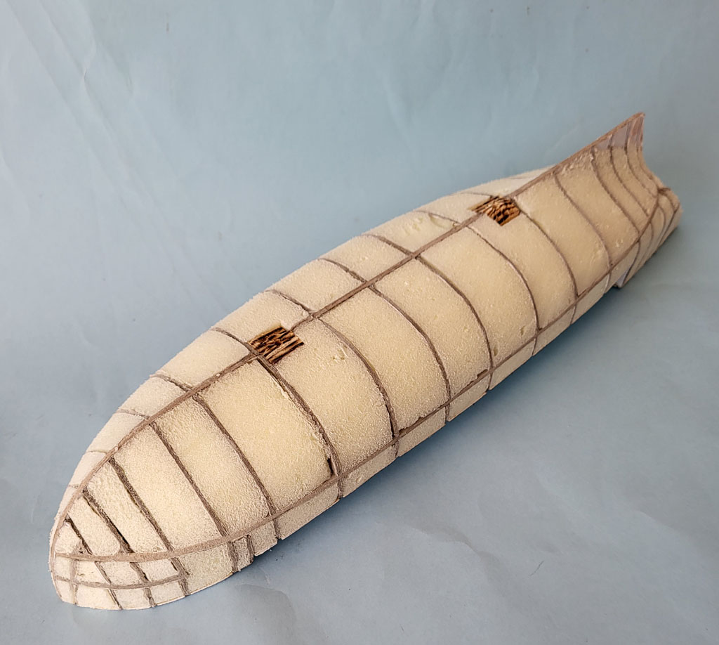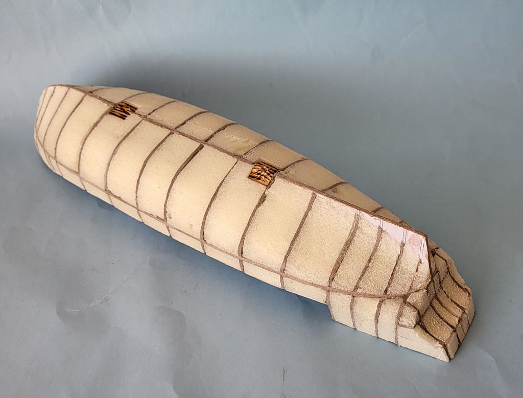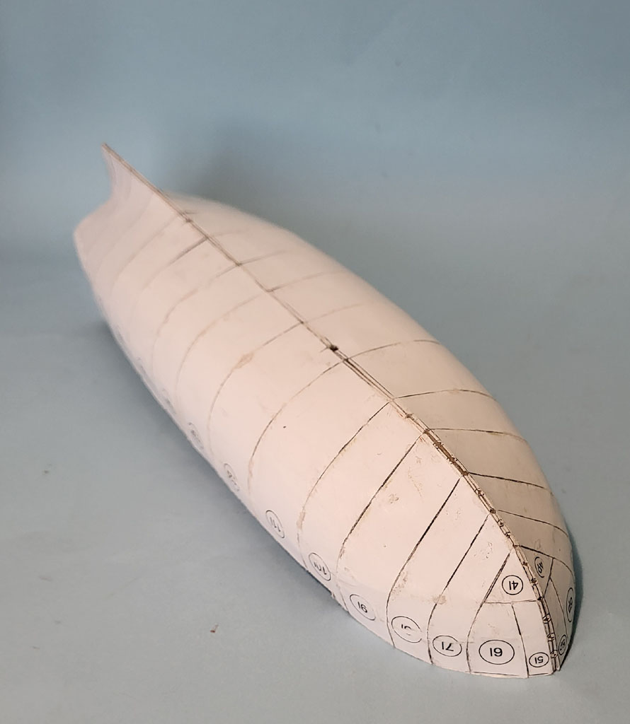 Wyschnięty kadłub - to pomiędzy wręgi wkleiłem styrodur . Po obcięciu nadmiaru i wyszlifowaniu okleiłem pierwszą warstwą z wycinanki . Myślałem że będą problemy z pasowaniem ale wyszło dobrze . Dorobiłem kilka drobiazgów Do następnego spotkania