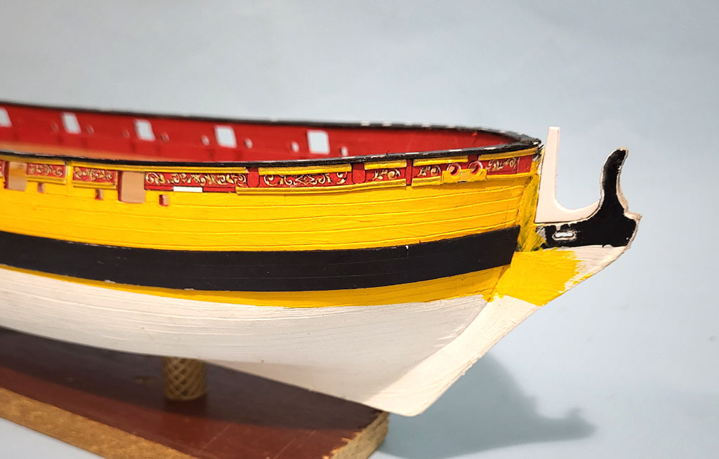 Pierw kadłub pomalowany farbą Renesans 01- biała (jako podkad) a dopiero żółtą Polycolor 118 . Żółty kolor słabo kryje dlatego biały podkład i kilka razy malowany żółtym