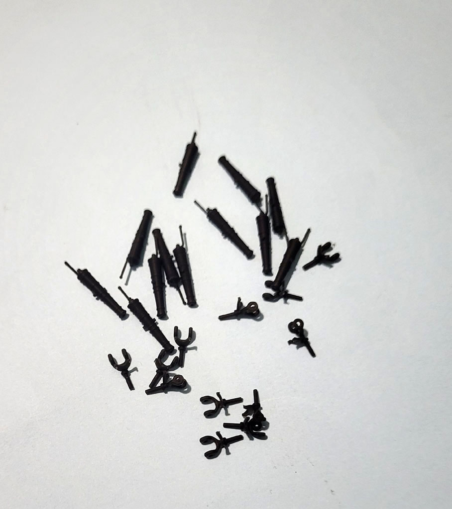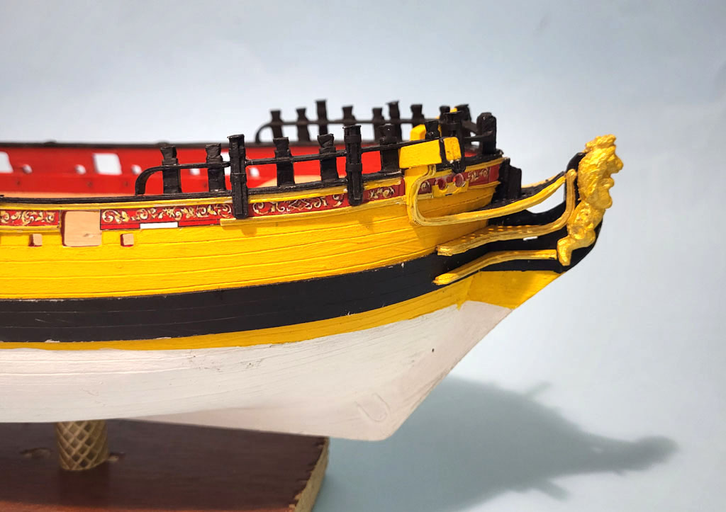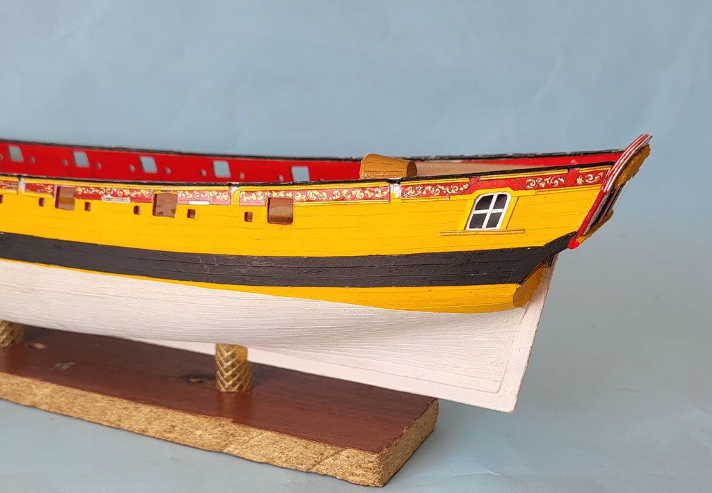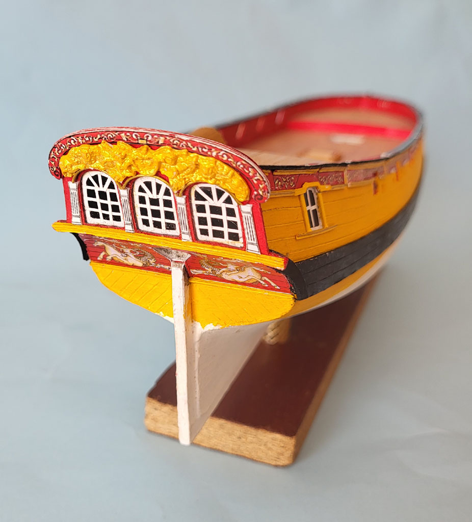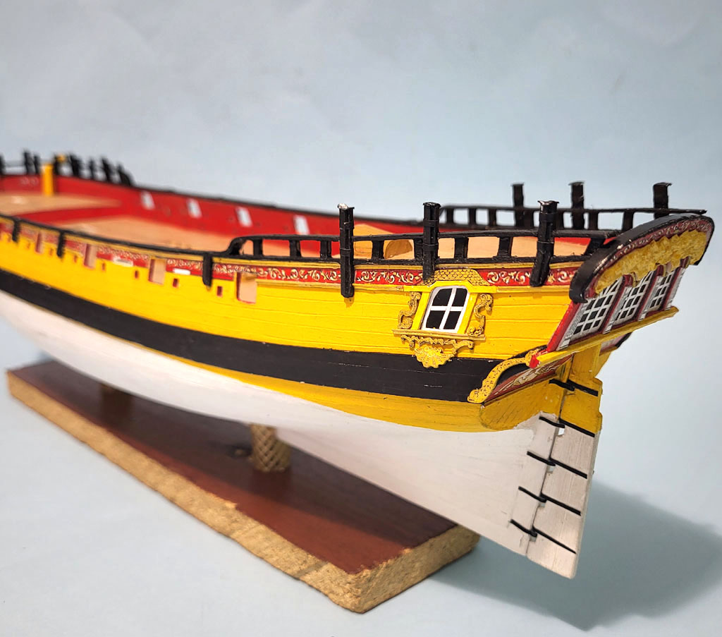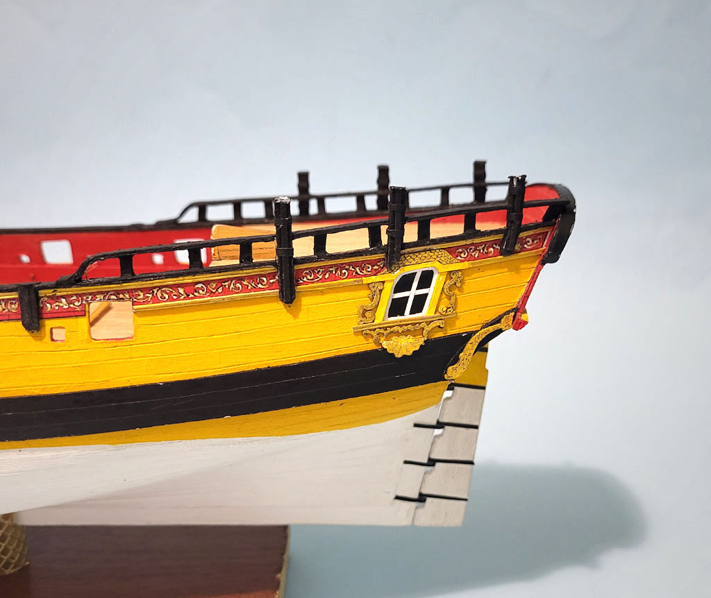 Dalszy ciąg zabawy na rufie . Porobiłem barierki ,podstawy pod falkonety tak samo na dziobie . Zakupiłem w SHYPYARD działa i falkonety bo chciałem zobaczyć jak to będzie wyglądać - Falkonety składają się z dwóch elementów wyglądają kapitalnie . Teraz miesiąc przerwy dla nabrania werwy - wyjazd do sanatorium ARKA w Kołobrzegu