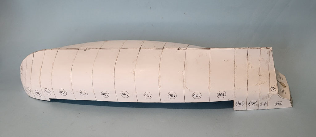 Wyschnięty kadłub - to pomiędzy wręgi wkleiłem styrodur . Po obcięciu nadmiaru i wyszlifowaniu okleiłem pierwszą warstwą z wycinanki . Myślałem że będą problemy z pasowaniem ale wyszło dobrze . Dorobiłem kilka drobiazgów