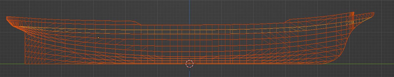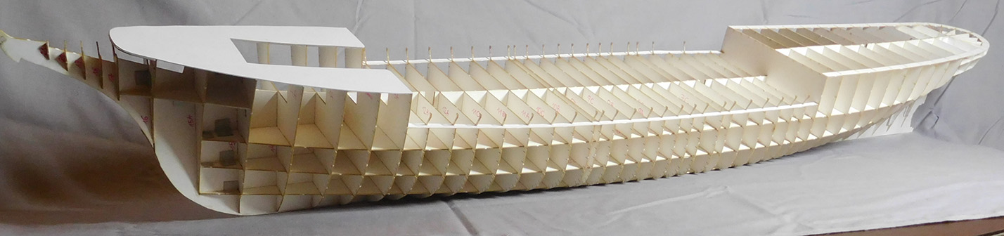 Zaczęło się od wstawienia skanów linii teoretycznych do CADa i narysowania ich od podstaw. Potem wyznaczyłem dodatkowe wręgi w potrzebnych mi miejscach oraz wg planów Kozaka naniosłem przebieg pasm blach poszycia. Po spasowaniu i „wygładzeniu” całości zaczęły powstawać rysunki elementów szkieletu i pokładów. W celu dokładnego wyznaczenia rozwinięć blach poszycia zbudowałem w blenderze siatkę połówki kadłuba i użyłem wtyczki „export model paper”. Po wyciągnięciu tych rozwinięć z blendera (robi to w fomacie pdf), wstawieniu do CAD-a i wyskalowaniu naniosłem linie nitów (CAD naliczył ich ponad 50 tyś.). Poszycie modelu składa się z dwóch warstw – pierwsza konstrukcyjna, elementy z tektury 1mm klejone do wręg i łączone podłużnie na styk oraz druga -imitacja blach, wydruk na papierze 90gr i „wydziobanymi” ręcznie liniami nitów. Pierwsza warstwa ma dodatkowe podłużne podziały na pasmach przypadających na wyobleniu dna ale niestety i tak widać delikatne podłużne załamania (nie wiem jak oni to robili w stoczni, że pasma z 14mm blachy nie mają żadnych załamań, są gięte w dwóch kierunkach – widać to wyraźnie na zdjęciach Daru w suchym doku) Druga warstwa naklejona na pierwszą z charakterystycznymi podłużnymi zakładkami.