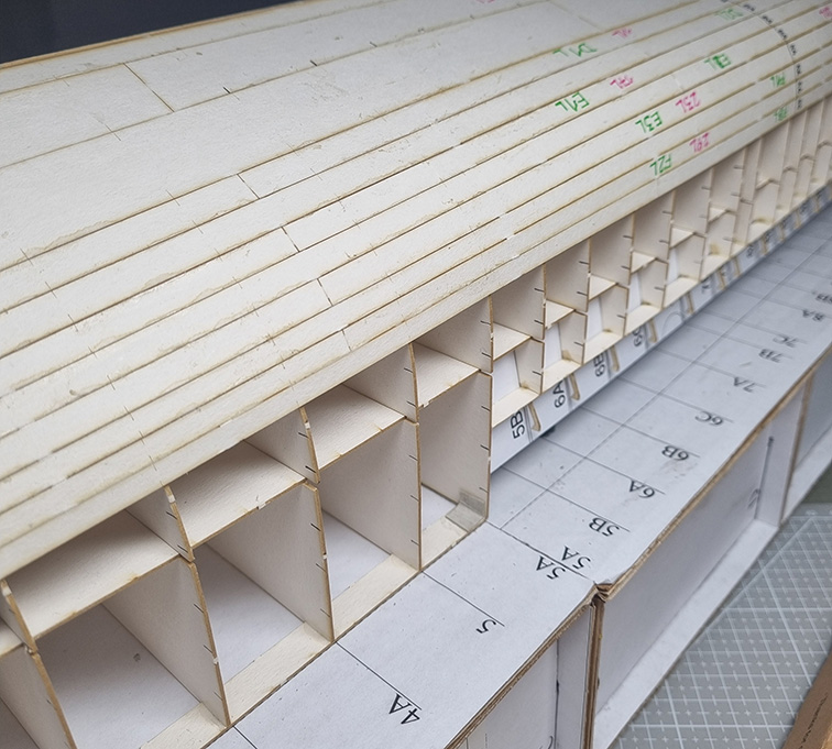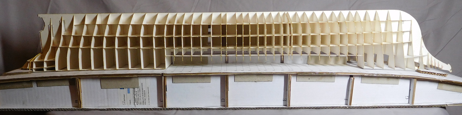 Elementy szkieletu i konstrukcji poszycia cięte laserem (ukłony dla p. Rafała z DRAF MODELU). Pokłady z tektury 0,5mm wykończone deseczkami szer.1,7mm z forniru bukowego 0,6mm również ciętymi laserem (są idealnie równe, ale przede wszystkim mają opalone, czarne krawędzie).