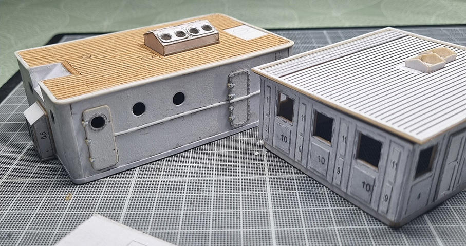 Dalsze części nadbudówek i wyposażenia sukcesywnie rysuję w CAD-zie i drukuję na drukarce laserowej na zwykłach kartkach A4 90gr. Dlatego też całość (z wyjątkiem oczywiście pokładu) po sklejeniu i obrobieniu jest malowana. Malowanie wyłącznie aerografami - pędzlem robię tylko poprawki. Używam farb akrylowych (Tamiya, Vallejo, AK).