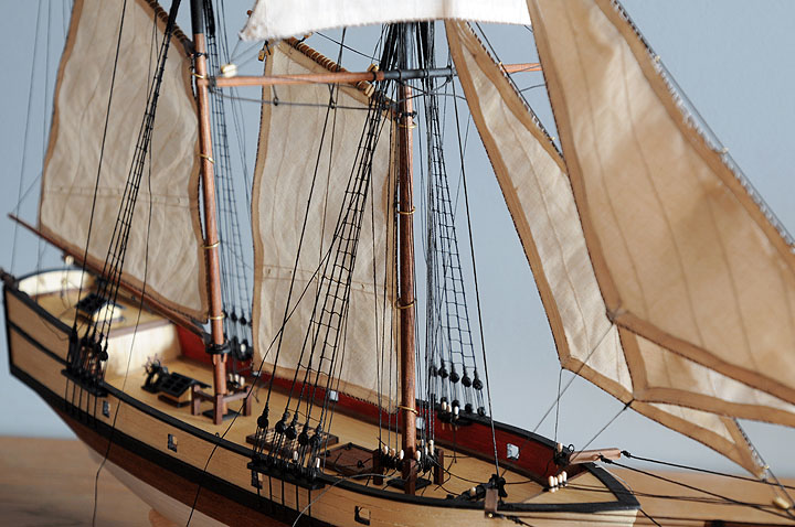 Nie żebym się czepiał ale czy nie powinno być więcej pierścieni mocujących żagiel do masztów . Z kolei chyba ciut za dużo przeszyć mocujących żagle do rei żagli gaflowych ( a tu plama nie wiem jak się zwą ) Tak efektwizualny jak dotąd b. ładny.