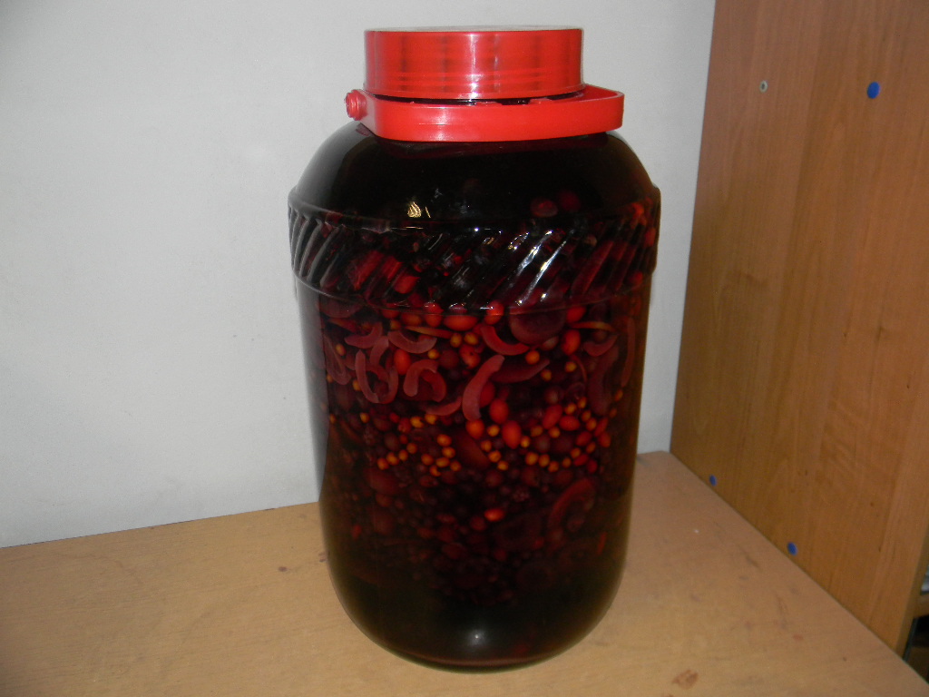 Teraz całość postoi tak jeszcze ze trzy cztery miesiące a później odleję od owoców i przefiltruję nalewkę, na Wielkanoc będzie można już degustować