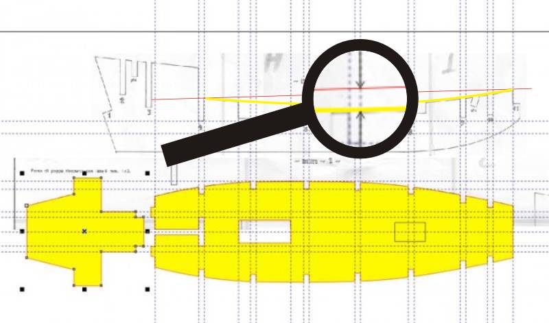 Romku, takie pytanko, odnośnie rysunku. Jak widać pokład ma kształt łuku, a łuk jest dłuższy od prostej. Ty założyłeś że pokład tworzy od dziobu do rufy linię prostą, stąd otwory na wręgi szkieletu są na tych samych liniach co otwory na wręgi w pokładzie.