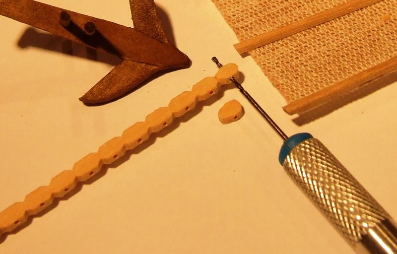 Zanim olinujemy model, najpierw z listewki wycinamy zarysy bloczków i wiercimy.
