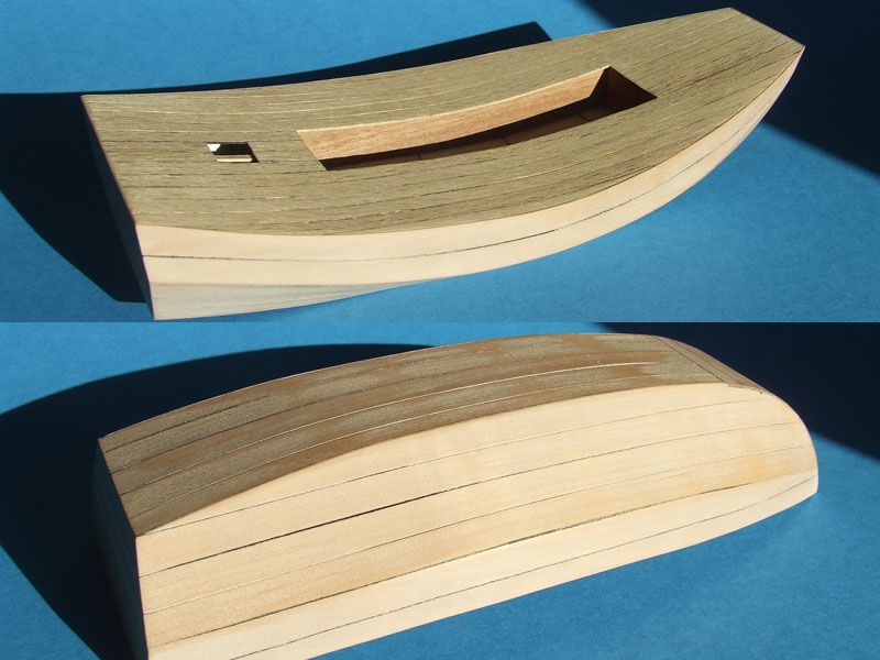 Wnęka kryta listewkami wykonanymi z forniru brzozy, wymiary 7x30. Czy nie za krótkie? Nie wiem jeszcze czy poszycie pokładu kontynuować takimi listewkami czy może zrobić po jednej listwie na długości. Wnęka i tak będzie raczej zakryta po złożeniu nadbudówki. Do wnętrza będzie się zaglądać po zdjęciu płyt z "dachu".