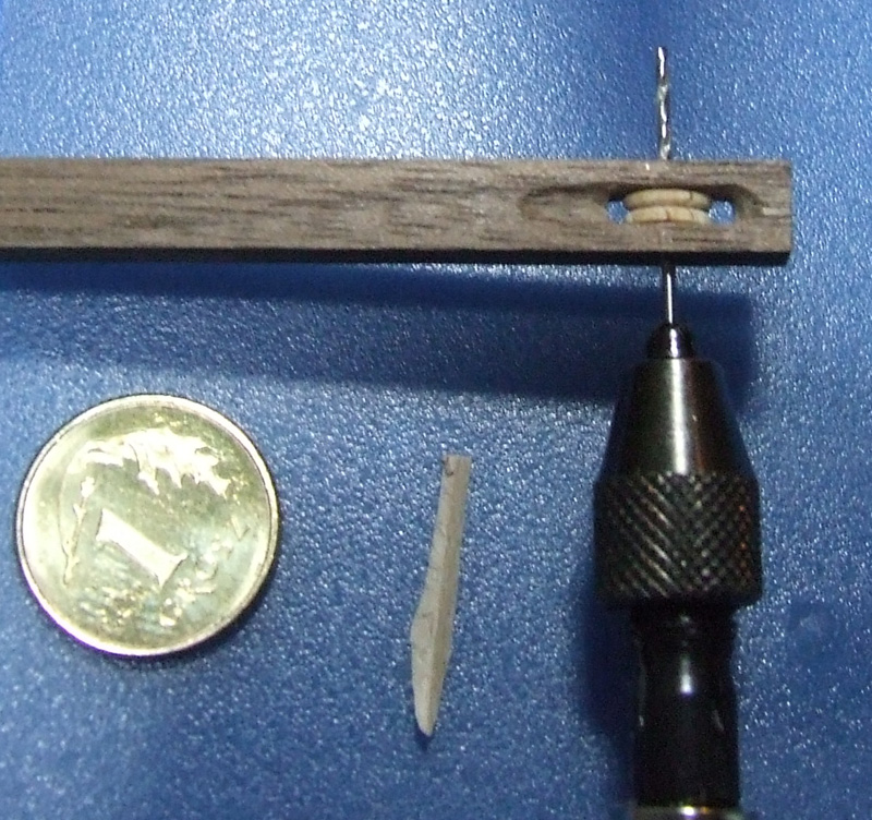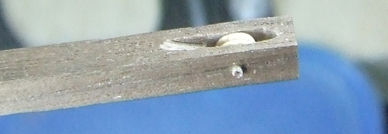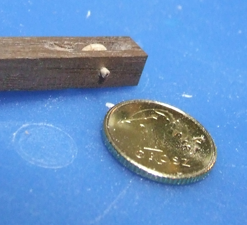Coś mi jednak nie grało więc zakołkowałem końce osi drzazgami z orzecha amerykańskiego. Nawierciłem ośkę najmniejszym wiertełkiem jakie miałem - 0.2 (przy okazji jedno złamałem :evil: )