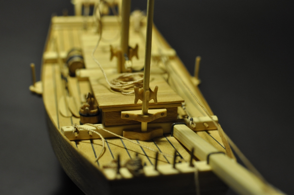 Dodatkowo wykonałem dwie knagi, które zostały zamocowane do przedniego masztu. Knagi przewierciłem a w otwory wkleiłem drut miedziany (drucik z kabla internetowego tzw. „skrętka”). Maszt został również przewiercony (otwór Ø 0,5 mm), w otwór wsunąłem drut z knagą (ma to na celu pewne zamocowanie knag do masztu, który wcześniej został zaimpregnowany pokostem lnianym).